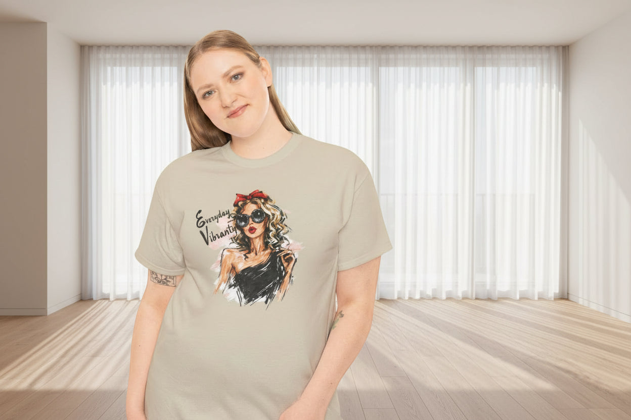 Soft, breathable tee that feels like your favorite go-to — but with a hand-sketched, fashion-forward illustration front and center. The watercolor-style portrait and handwritten script give this shirt an effortless, vintage-glam vibe: sunlit hair, bold sunglasses, and a splash of red that reads like an exclamation. It wears relaxed and easy, so you can toss it on with denim or a slip skirt and step out feeling composed and a little mischievous. This is for people who collect moments — café mornings, gallery walks, rooftop evenings — and want clothing that quietly tells a story about style and confidence.