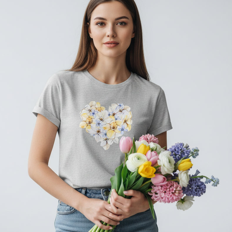 A soft, lived-in tee that carries a quiet, floral whisper across the chest. The delicate floral heart print feels like a private little emblem—gentle, feminine, and calm—meant for mornings with tea, long walks through neighborhood gardens, or lazy afternoons curled up with a book. Lightweight and semi-fitted, this shirt layers easily under a cardigan or stands on its own with high-waisted jeans. The ribbed collar and shoulder tape keep the shape wash after wash, while the tear-away label prevents irritation. It’s the kind of tee you reach for when you want something comfortable that still reads thoughtful and quietly romantic.