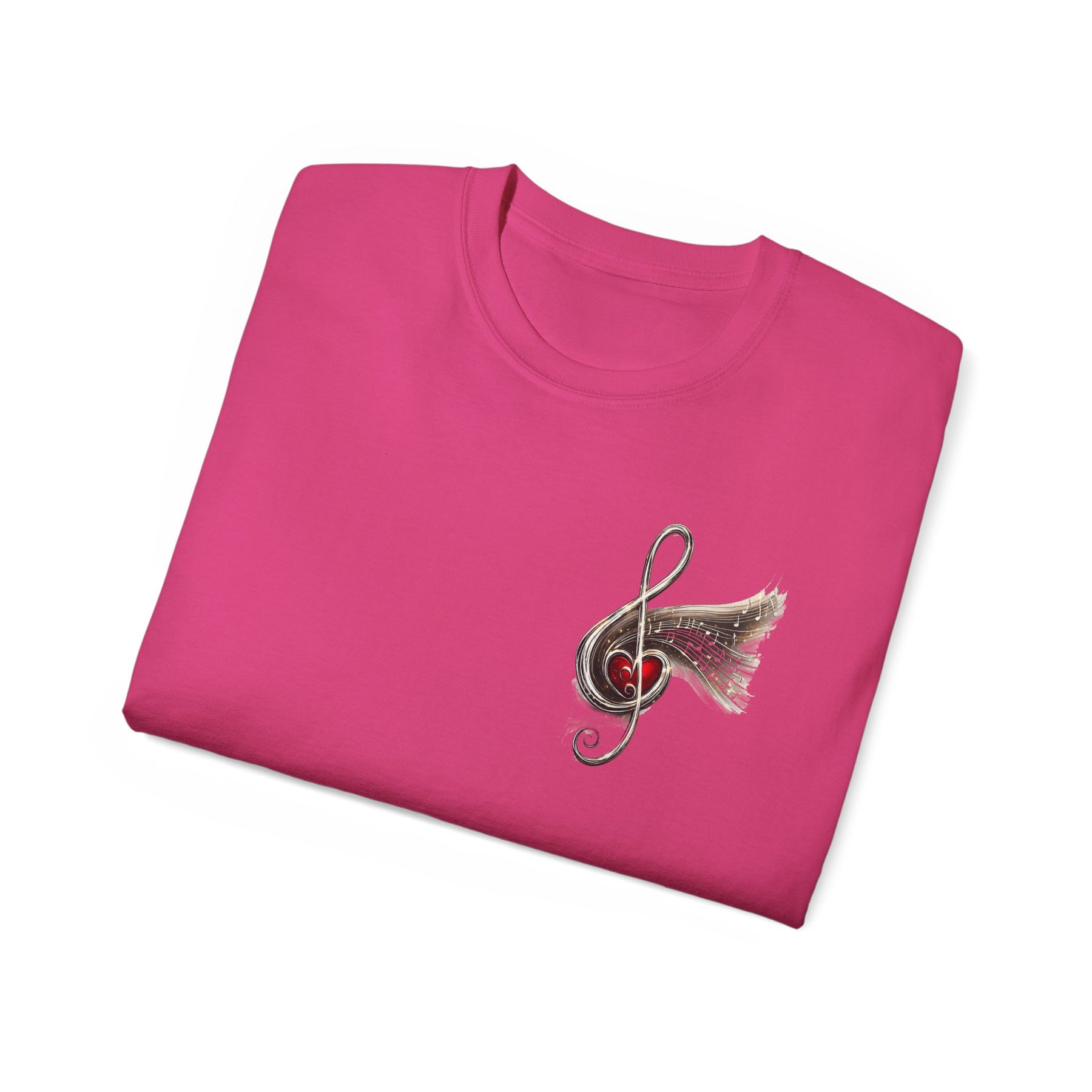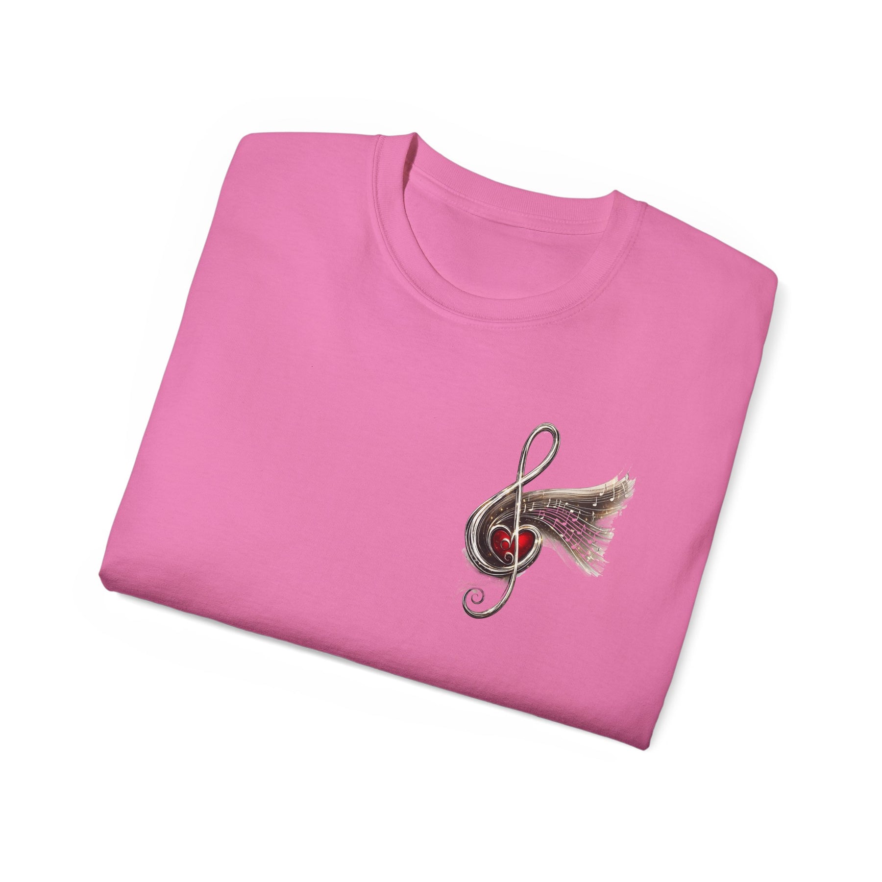 Woman wearing a pink t-shirt with a graphic design on a white background