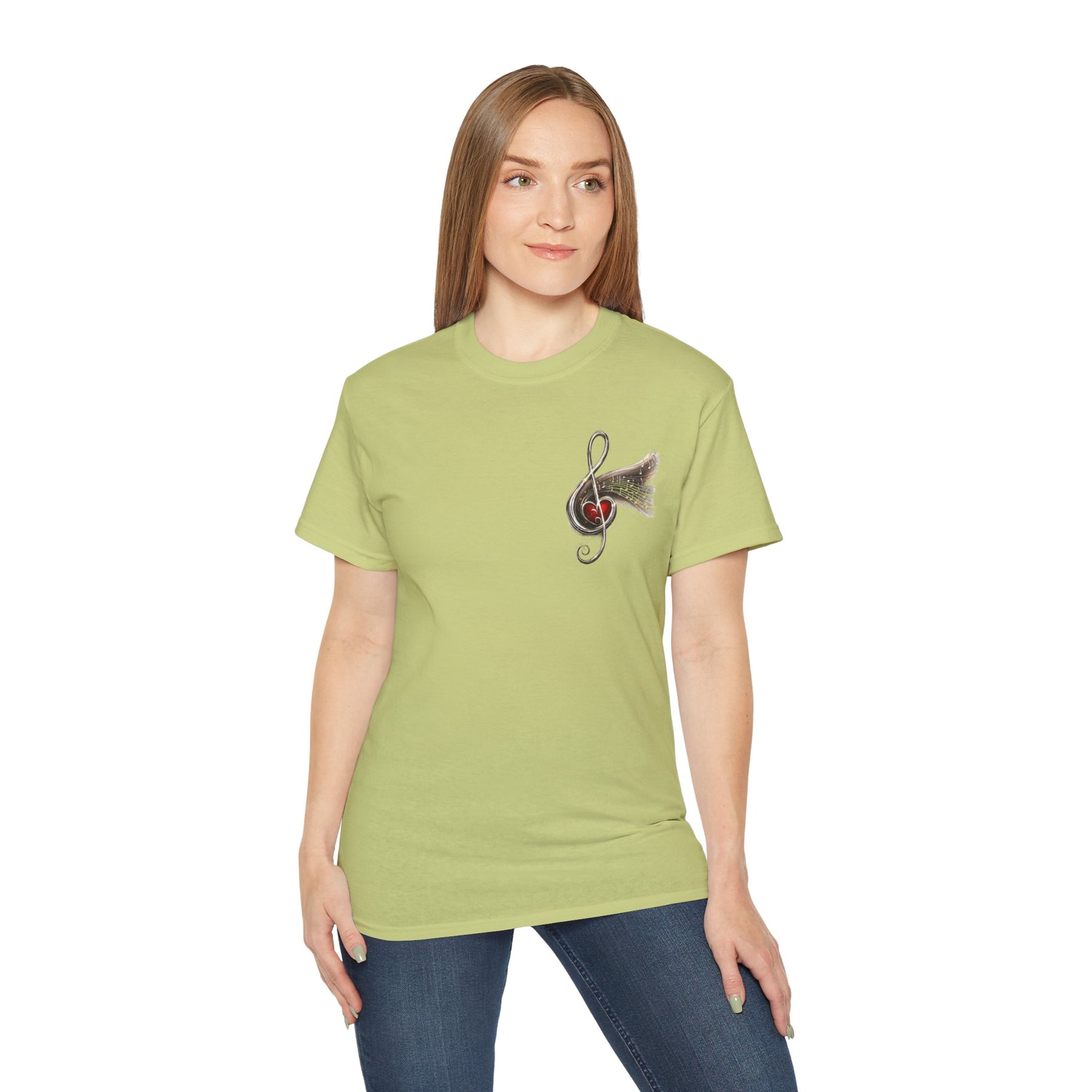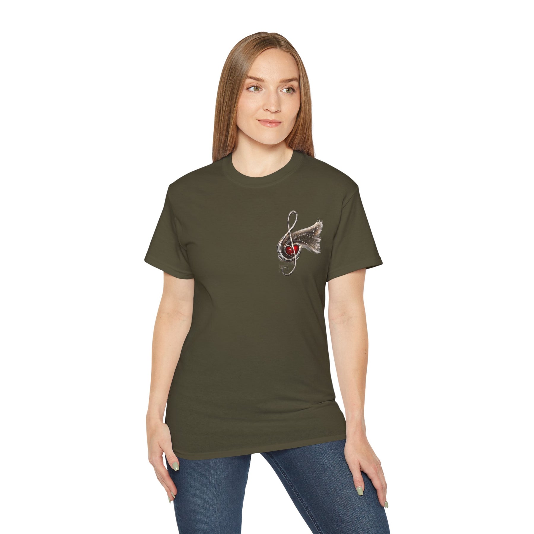 Woman wearing a khaki t-shirt with a graphic design on a white background
