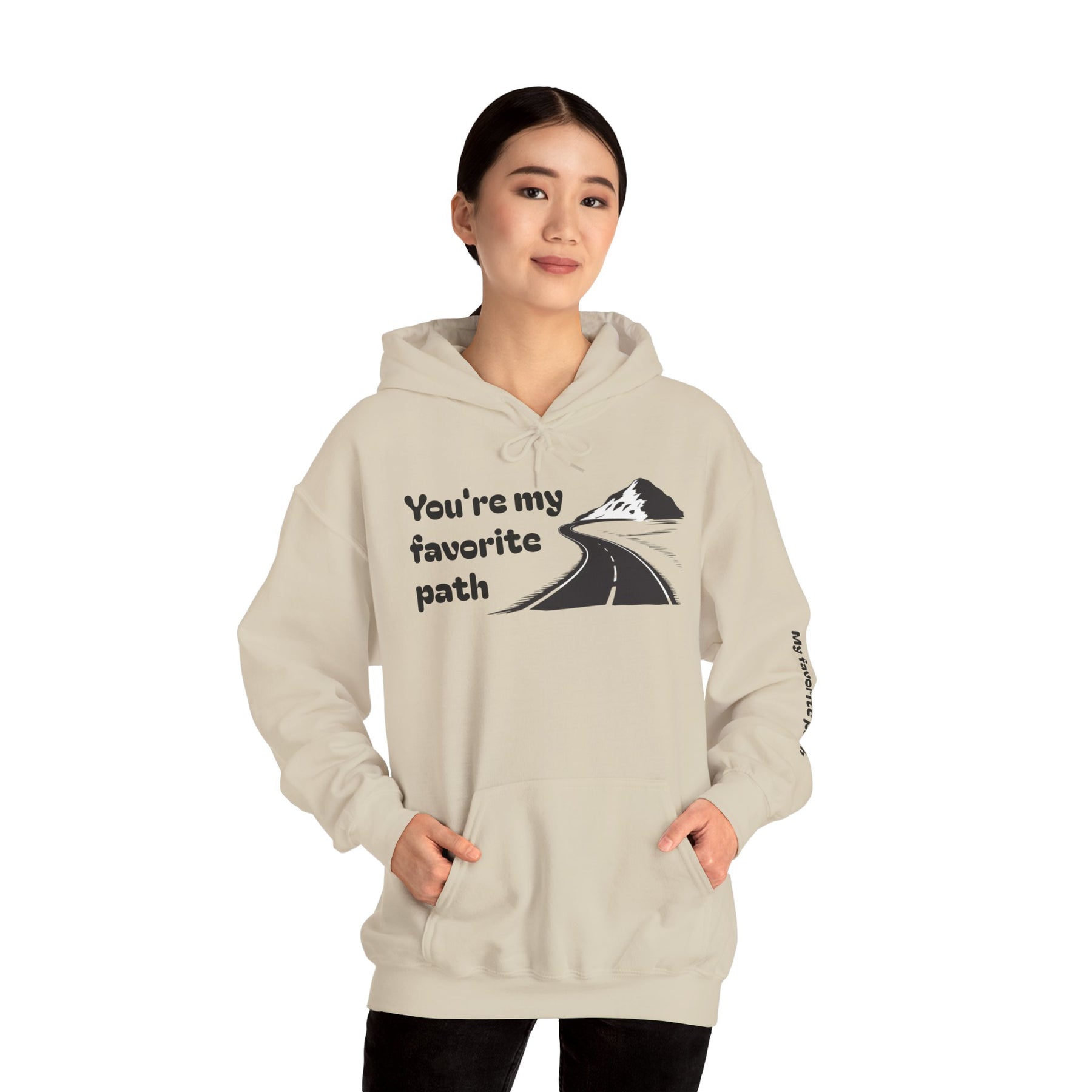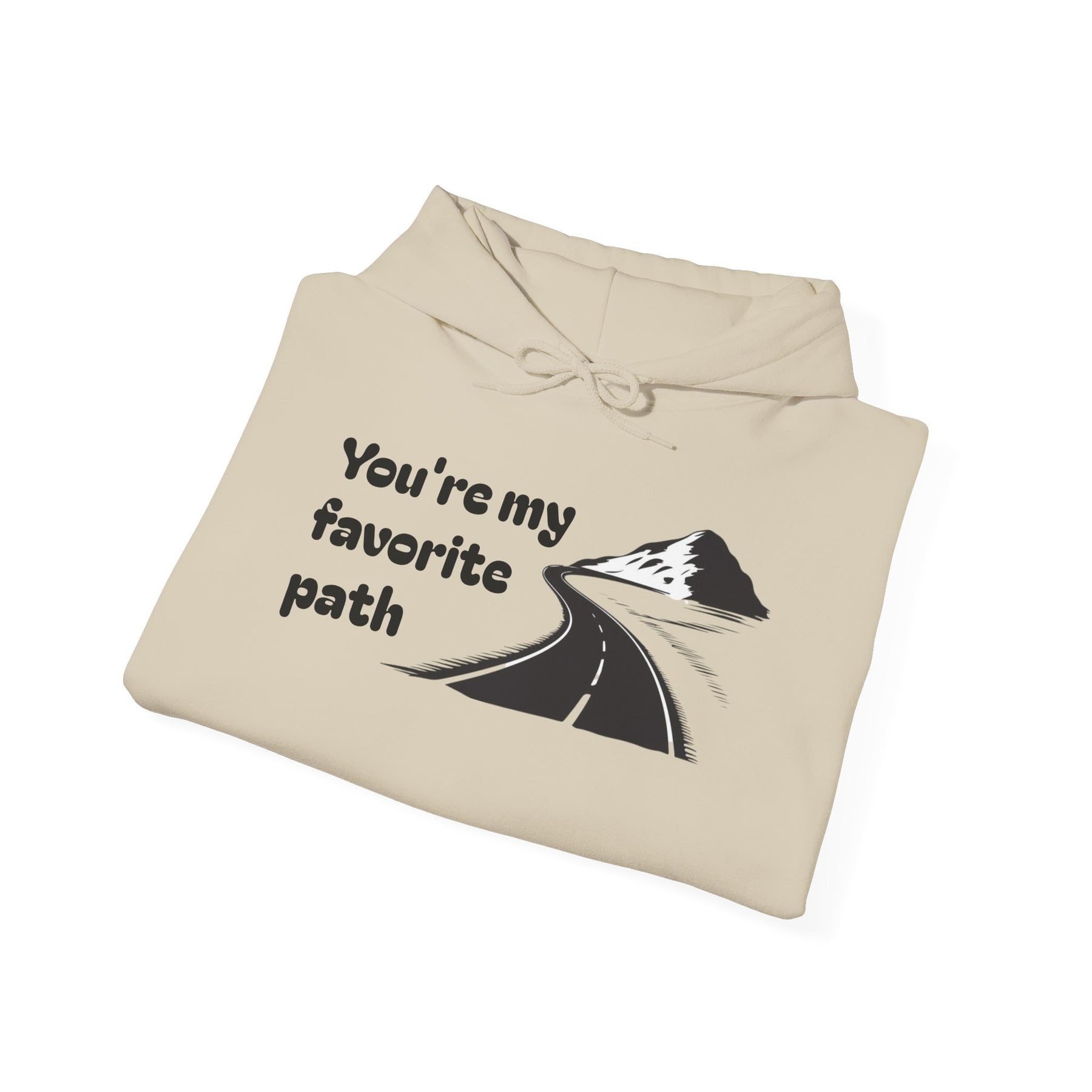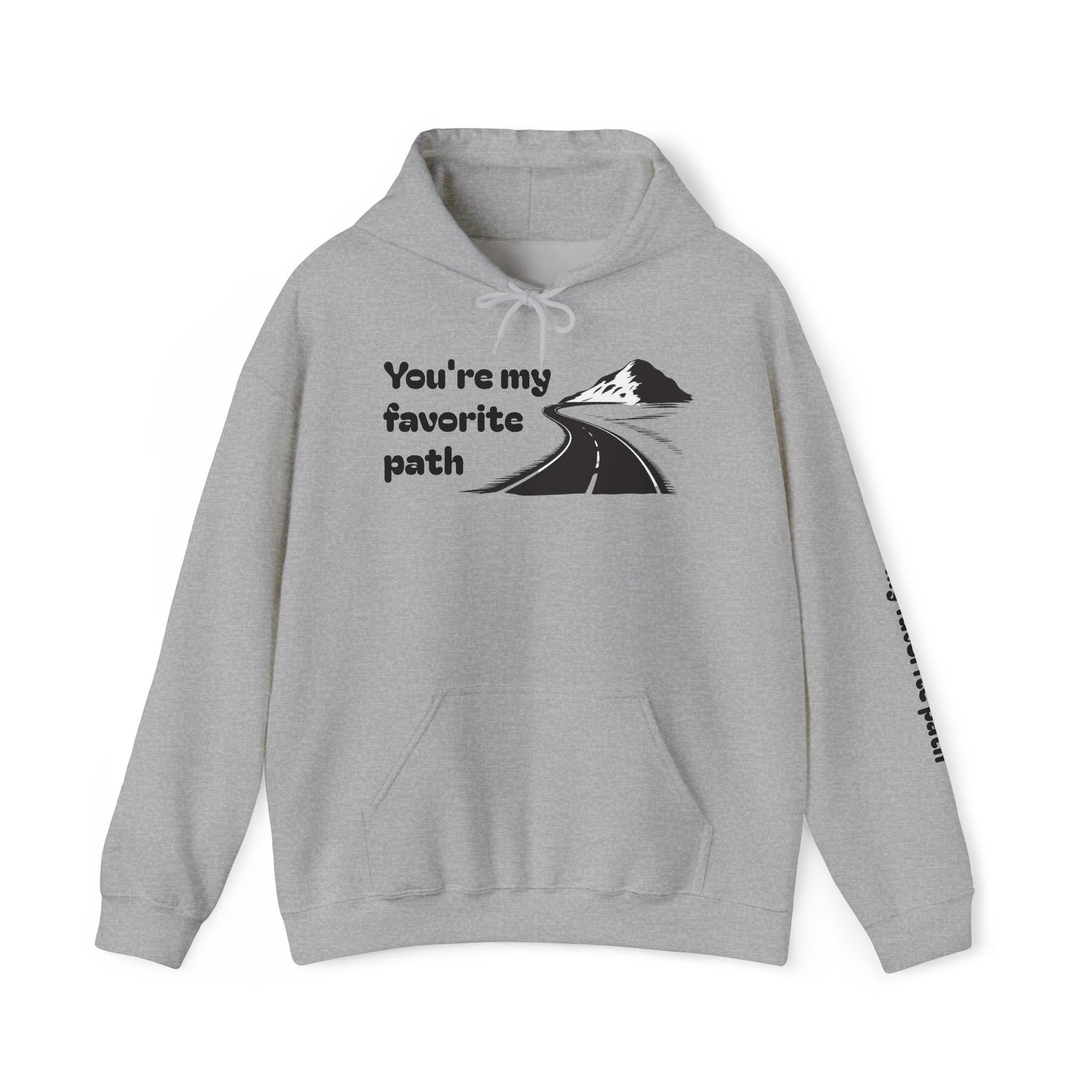A soft, mid-weight hoodie that feels like a quiet morning walk. The front shows a simple, hand-drawn road winding toward a distant peak with the words “You’re my favorite path,” and the same phrase runs along the sleeve for a subtle, personal touch. It’s warm without weighing you down, with a double-lined hood and color-matched drawcord for a clean finish. The roomy kangaroo pocket keeps hands cozy; tear-away label and smooth tubular knit make it comfortable against skin. Wear it on travel days, campsite evenings, or slow weekend strolls — it’s made to sit easily in everyday life and carry a little quiet meaning.