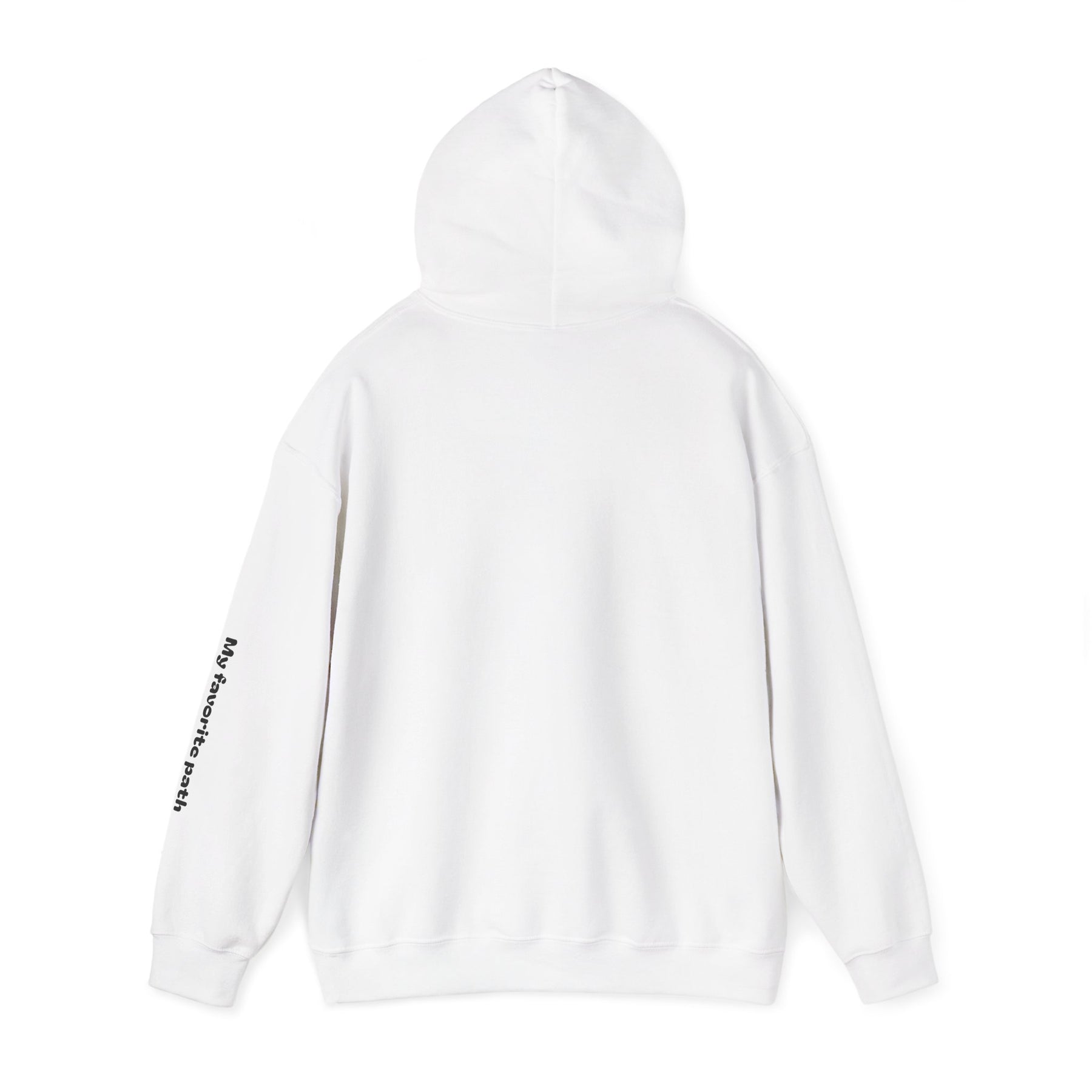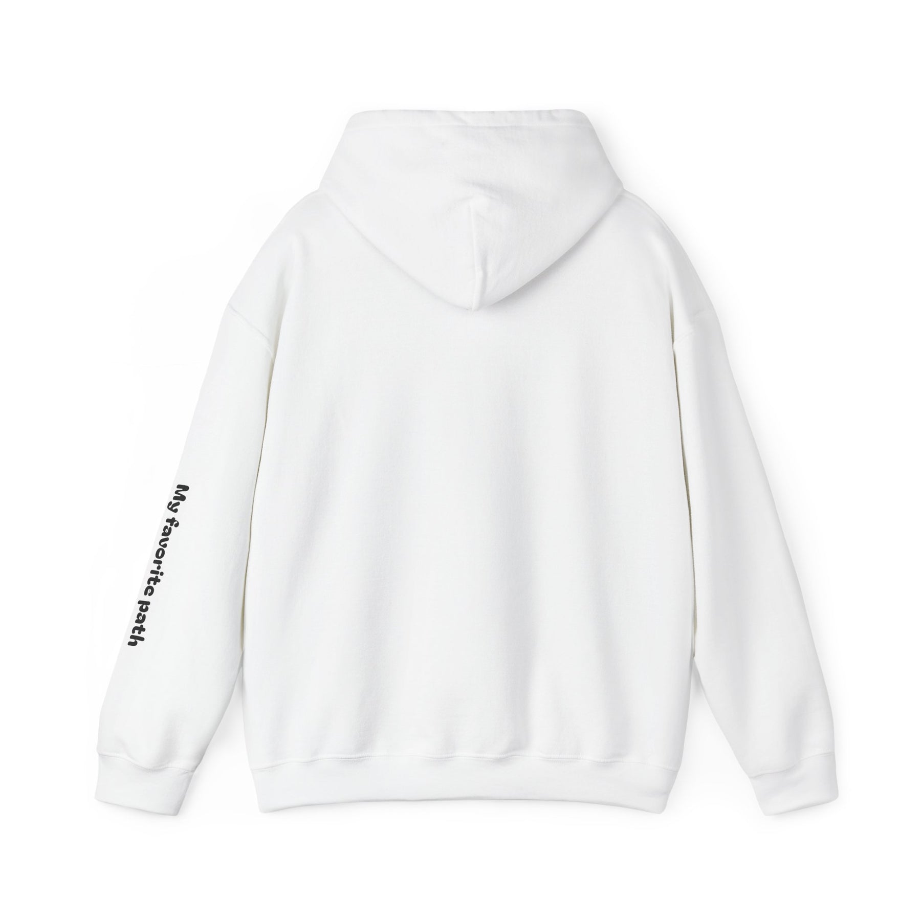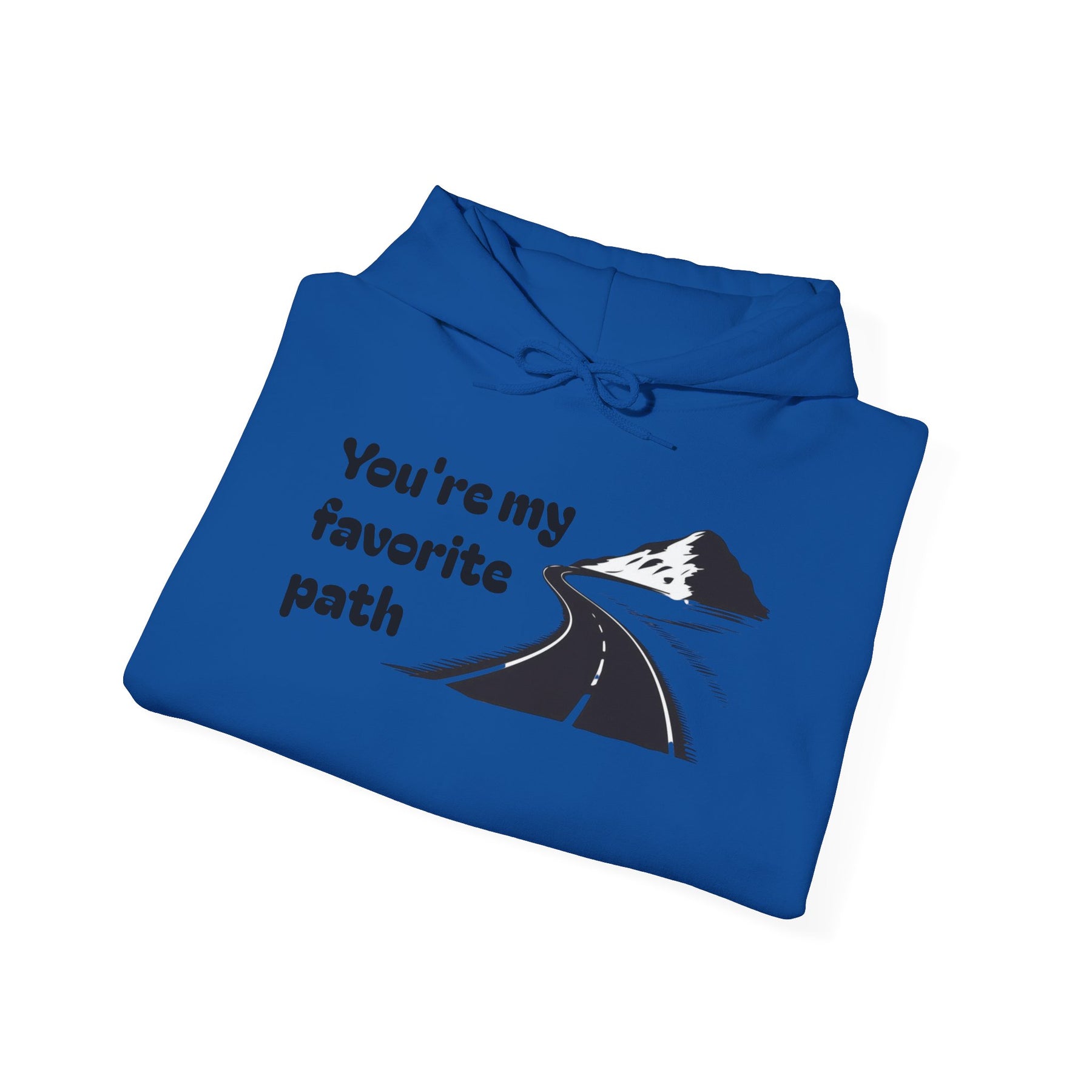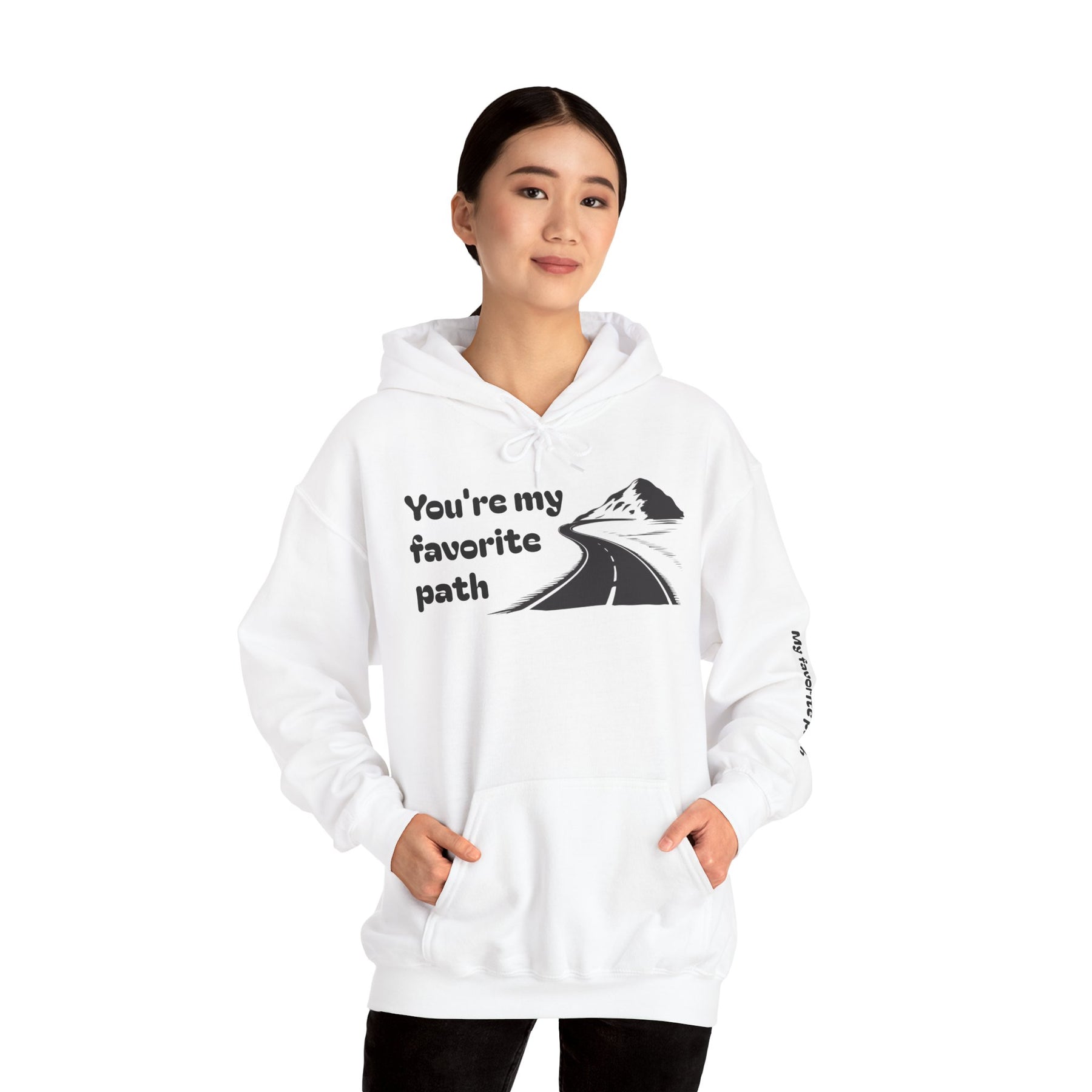 A soft, mid-weight hoodie that feels like a quiet morning walk. The front shows a simple, hand-drawn road winding toward a distant peak with the words “You’re my favorite path,” and the same phrase runs along the sleeve for a subtle, personal touch. It’s warm without weighing you down, with a double-lined hood and color-matched drawcord for a clean finish. The roomy kangaroo pocket keeps hands cozy; tear-away label and smooth tubular knit make it comfortable against skin. Wear it on travel days, campsite evenings, or slow weekend strolls — it’s made to sit easily in everyday life and carry a little quiet meaning.