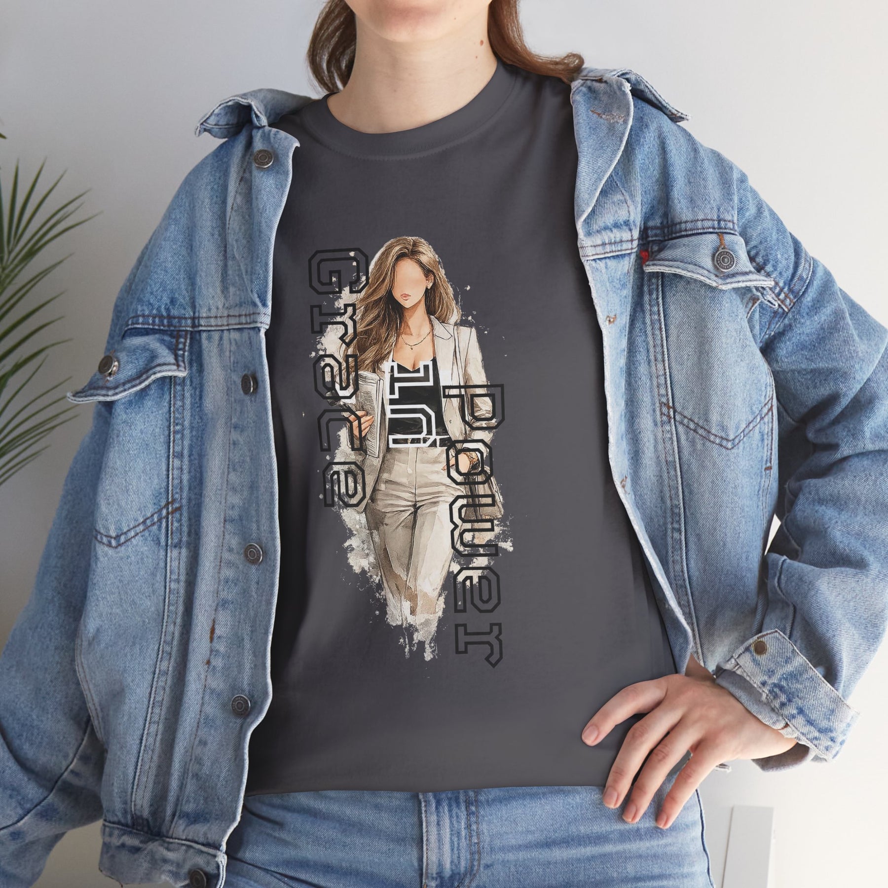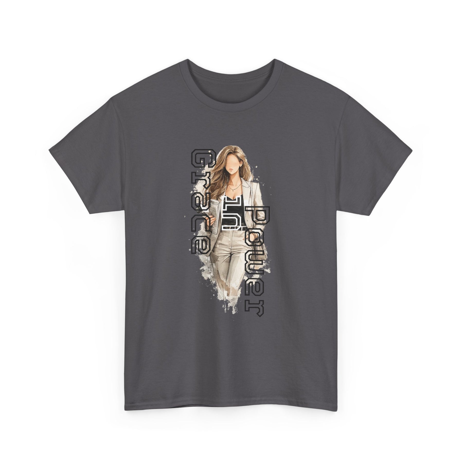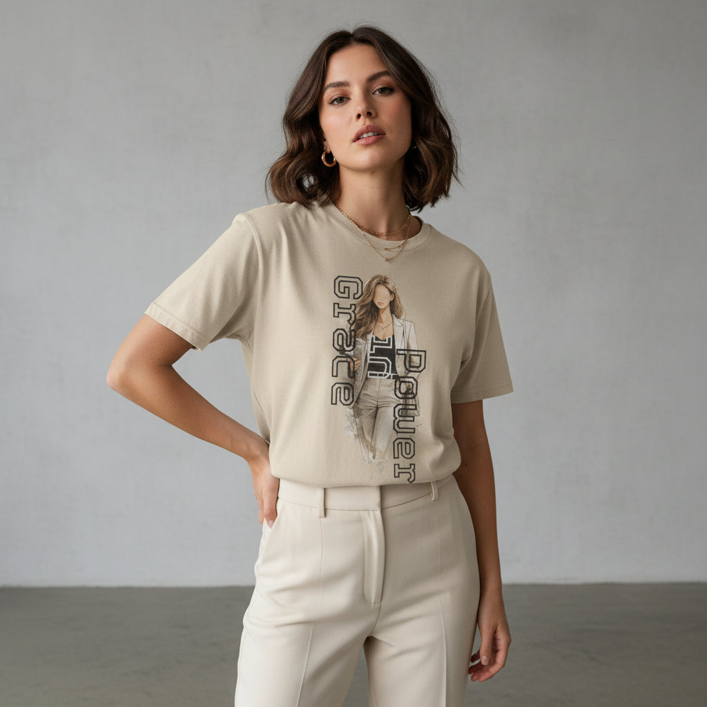 This relaxed, classic-fit tee brings a quiet, confident vibe to everyday wear. The soft natural cotton shows subtle flecks and frames a washed-out, editorial-style graphic down the front — a faded portrait with stacked, modern type that reads like a personal manifesto. It sits casually at the hips and keeps its shape with a ribbed collar and shoulder tape, making it an easy layering piece for streetwear looks or a low-key, styled outfit. Wear it with high-waist jeans and boots for a lived-in, effortless look that reads intentional but undone.