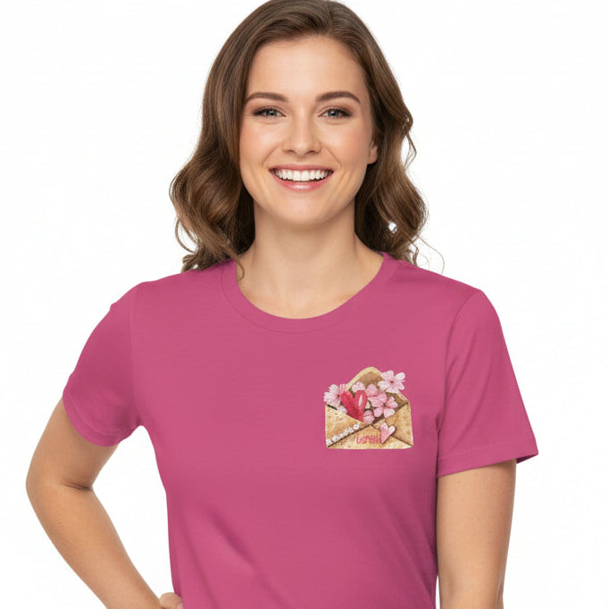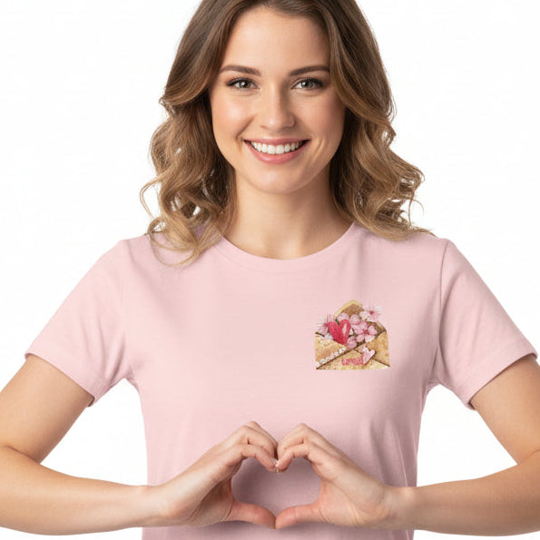 Soft, simple, and quietly expressive — this tee carries a small, heartfelt message that slips easily into everyday life. Lightweight and slim-cut, it feels like a second skin while the ribbed collar and shoulder tape keep its shape through repeated wear. The longer body length layers well under jackets or over high-rise jeans. Wear it to coffee catch-ups, low-key date nights, or afternoons at the studio; the subtle nod to love makes the shirt an understated way to share warmth without saying too much. It sits with people who prefer minimalist gestures: thoughtful, low-key, and sincere.