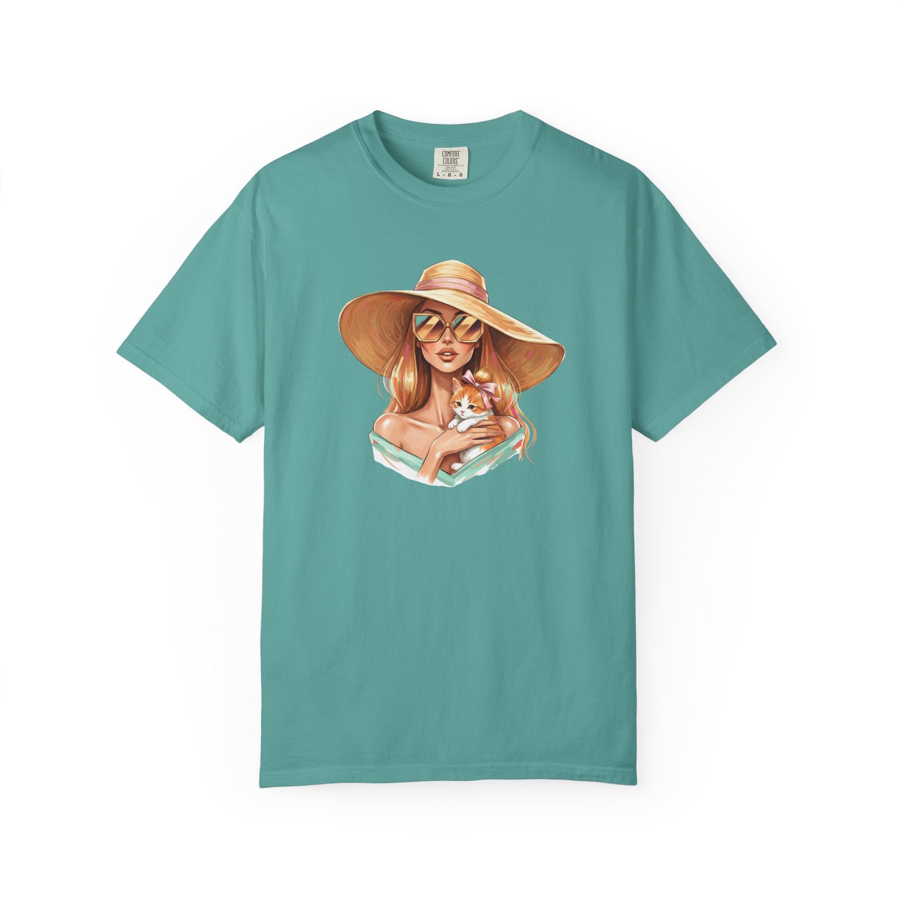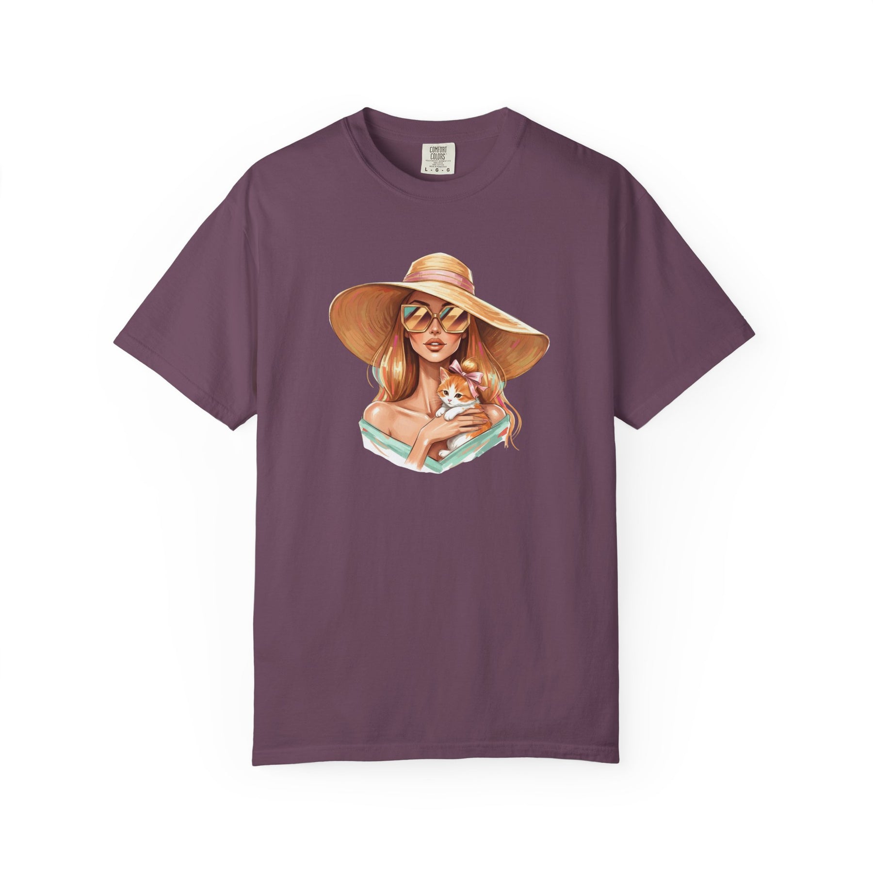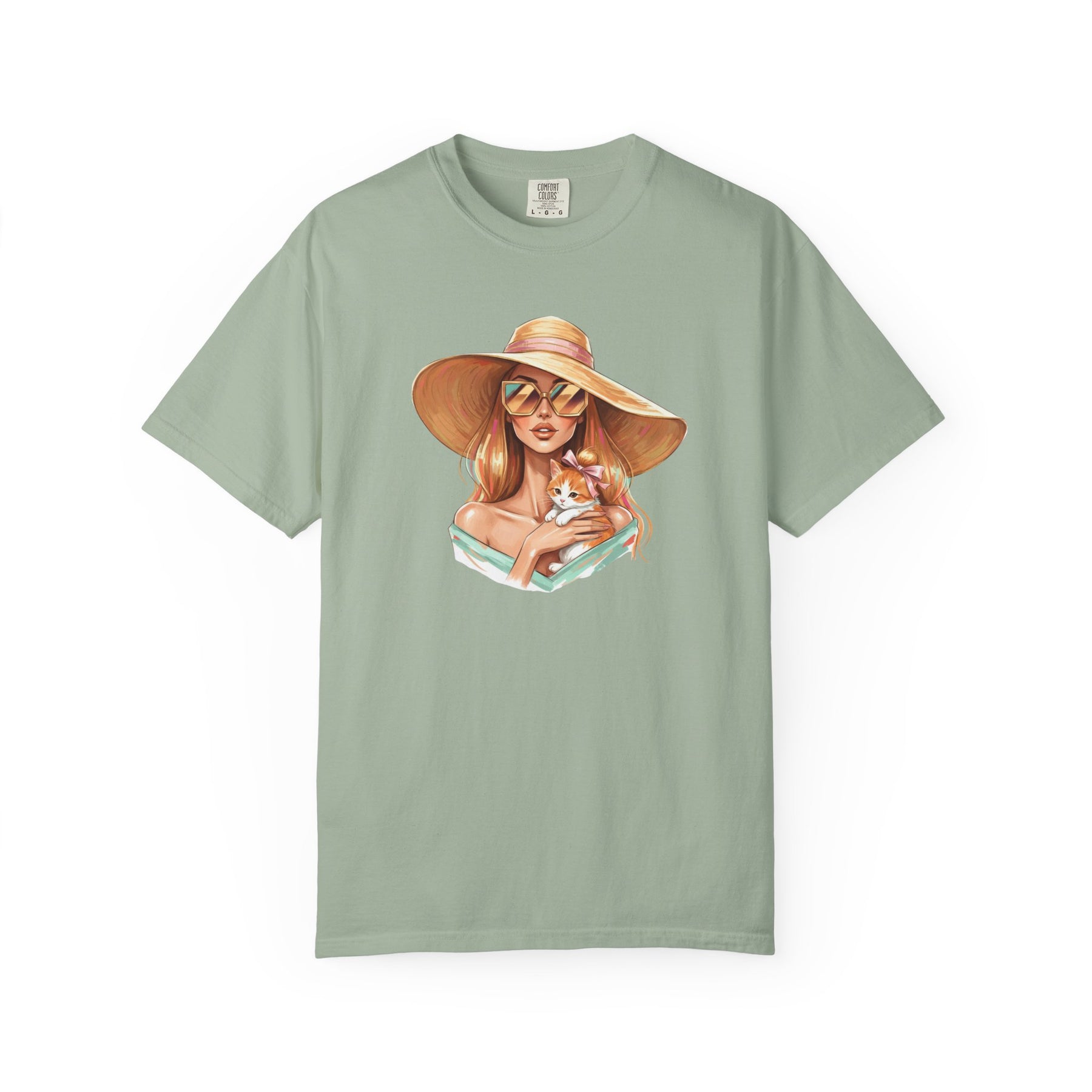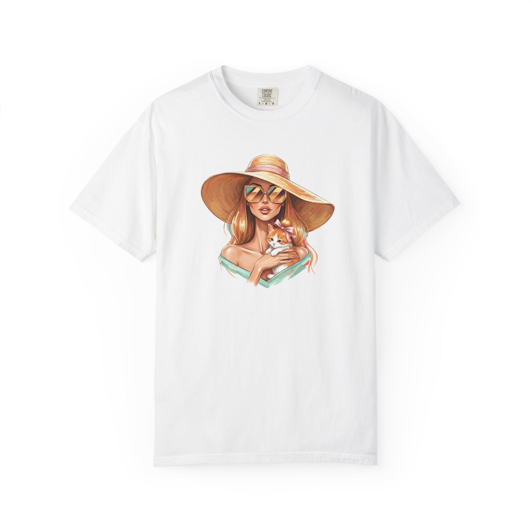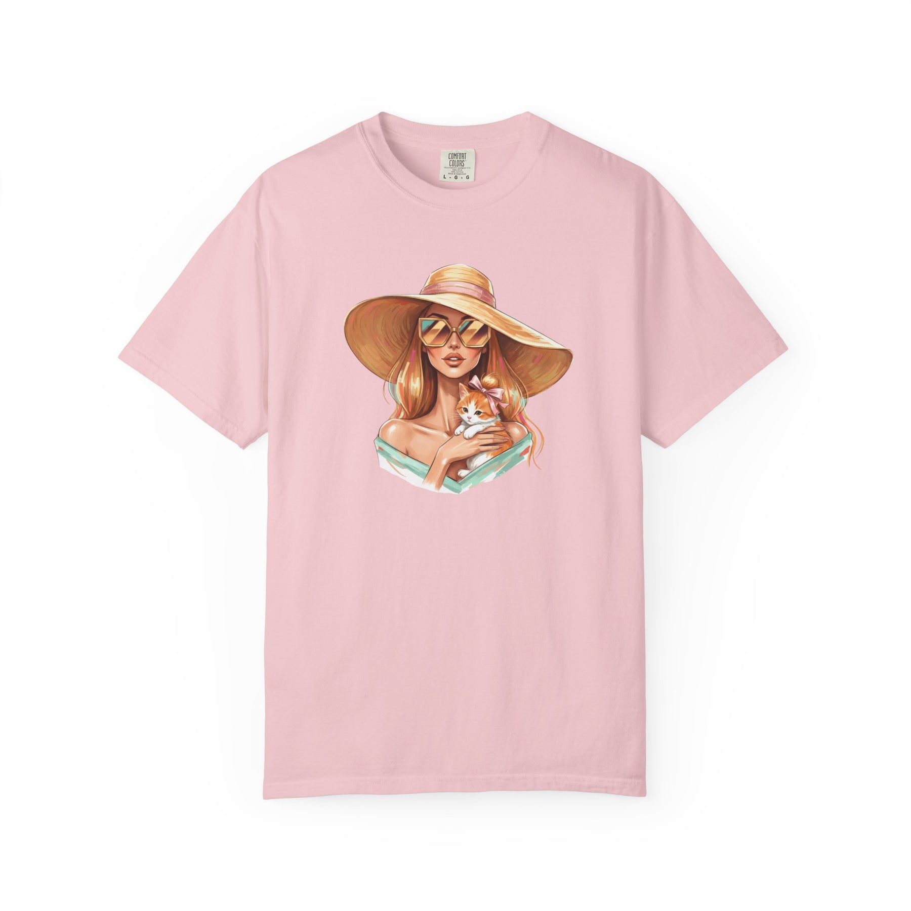 A relaxed, garment-dyed tee that celebrates effortless style with a playful twist: a fashion icon cradling a cat. Soft, lived-in color and heavyweight cotton give this shirt a comforting weight — the kind you reach for on slow mornings and city nights alike. Picture an editorial silhouette softened by an affectionate feline, the graphic balancing chic lines with a wink of warmth. Wear it to gallery openings, coffee shop hangs, or while sketching ideas at home; it reads like a quiet declaration of taste and tenderness. The relaxed cut and substantial fabric settle nicely on the body, while the garment-dyed finish and tubular knit create a vintage, slightly faded look that blends into your wardrobe rather than shouting over it. This tee speaks to people who value curated looks that still feel personal — those who pair thoughtful design with everyday comfort.