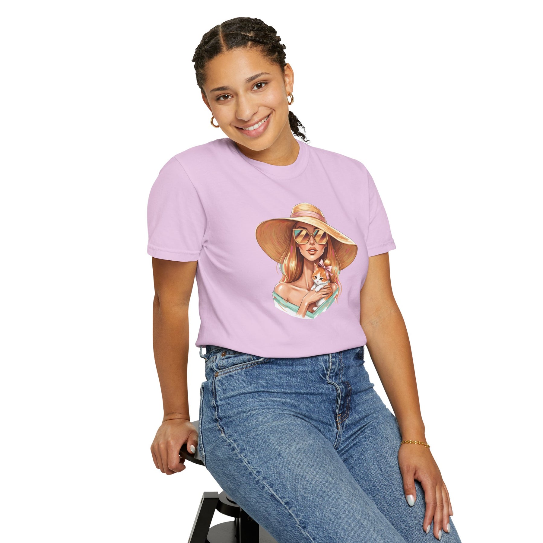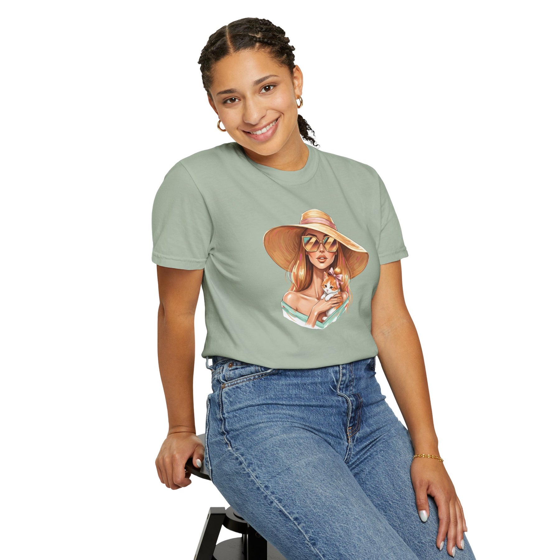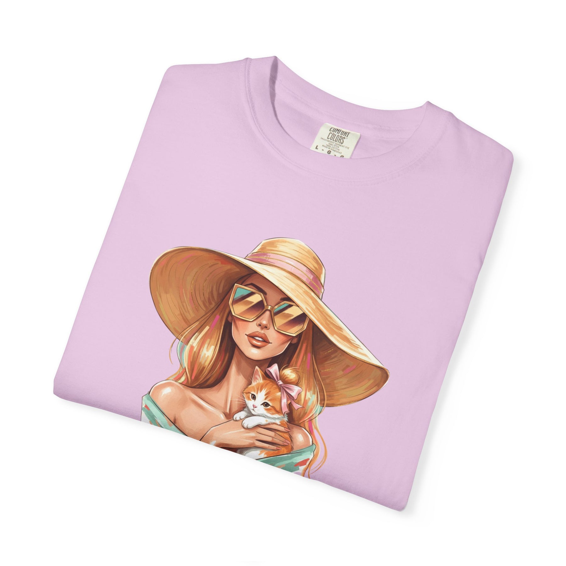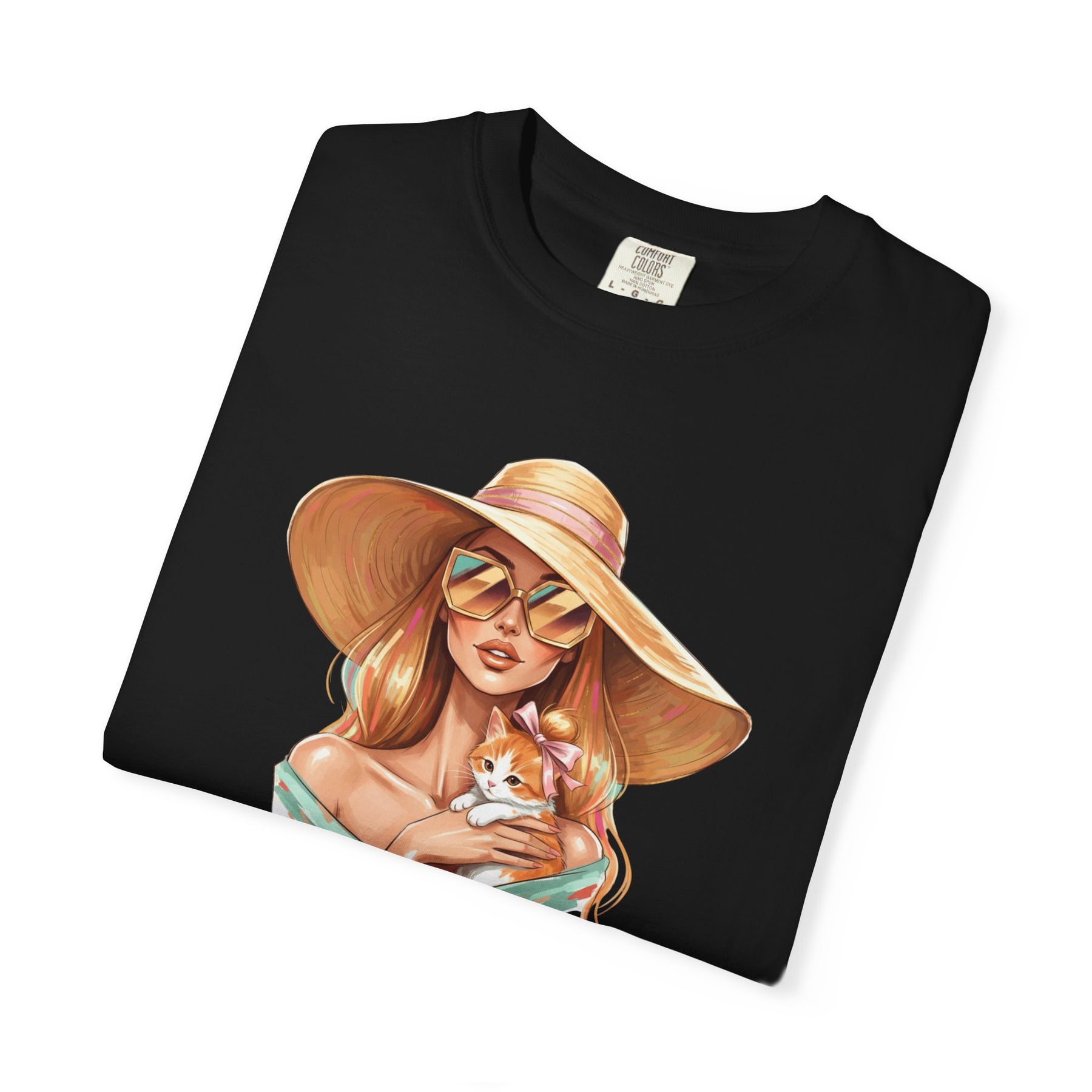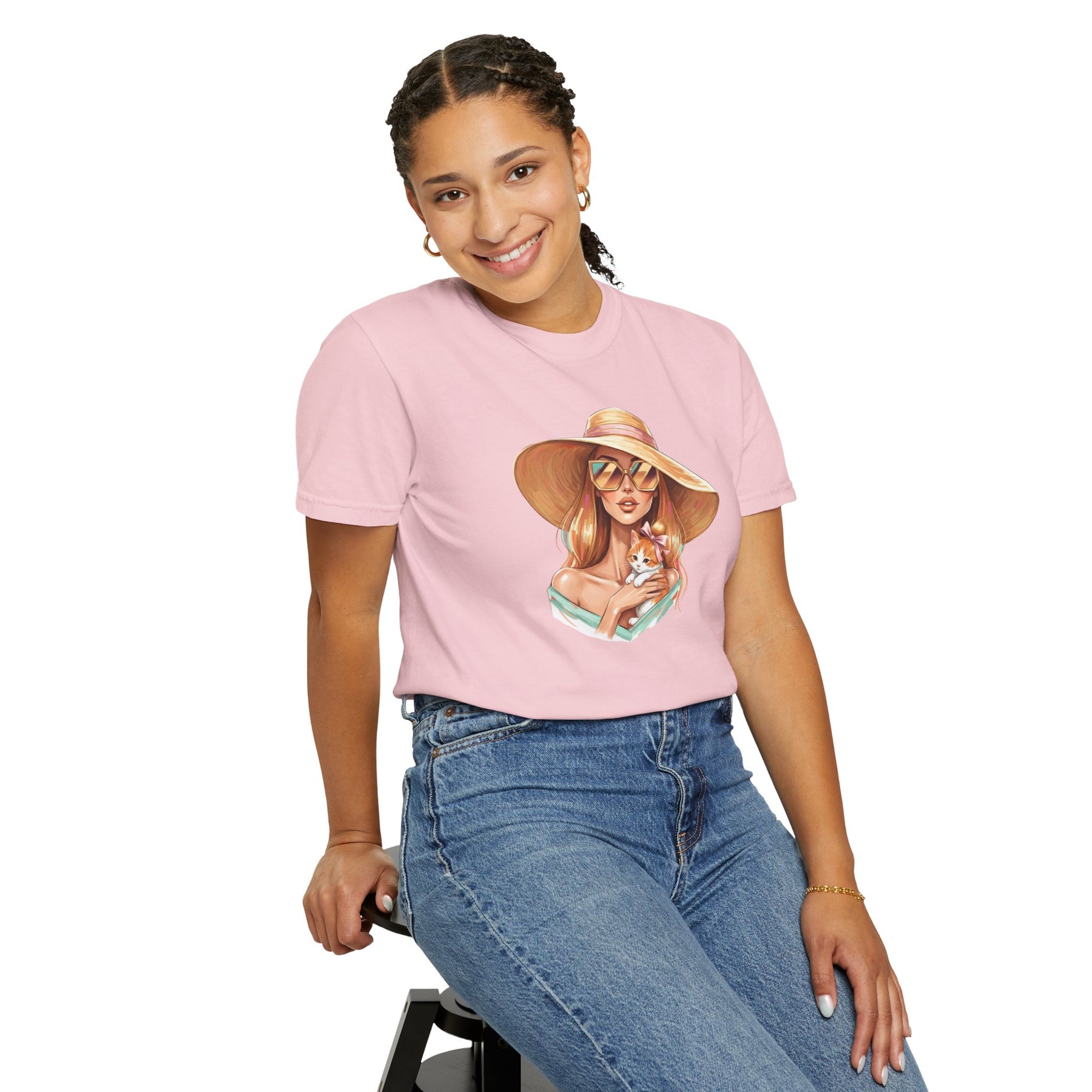 A relaxed, garment-dyed tee that celebrates effortless style with a playful twist: a fashion icon cradling a cat. Soft, lived-in color and heavyweight cotton give this shirt a comforting weight — the kind you reach for on slow mornings and city nights alike. Picture an editorial silhouette softened by an affectionate feline, the graphic balancing chic lines with a wink of warmth. Wear it to gallery openings, coffee shop hangs, or while sketching ideas at home; it reads like a quiet declaration of taste and tenderness. The relaxed cut and substantial fabric settle nicely on the body, while the garment-dyed finish and tubular knit create a vintage, slightly faded look that blends into your wardrobe rather than shouting over it. This tee speaks to people who value curated looks that still feel personal — those who pair thoughtful design with everyday comfort.