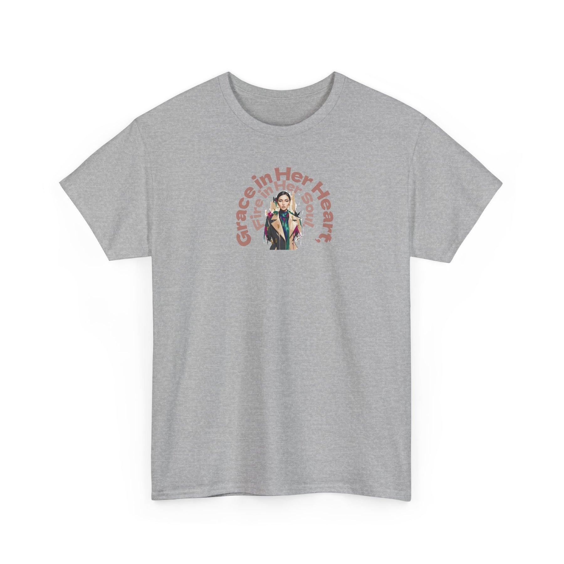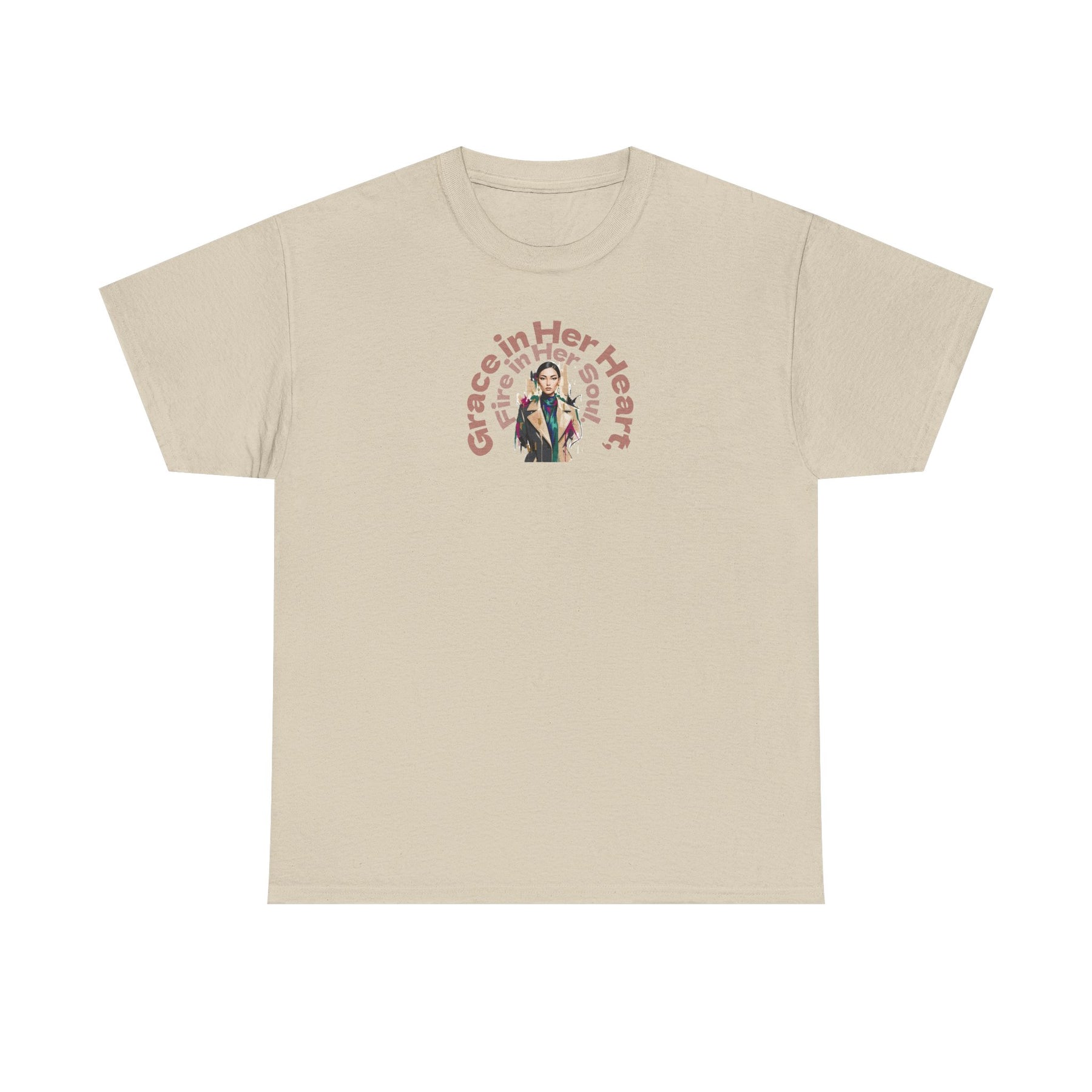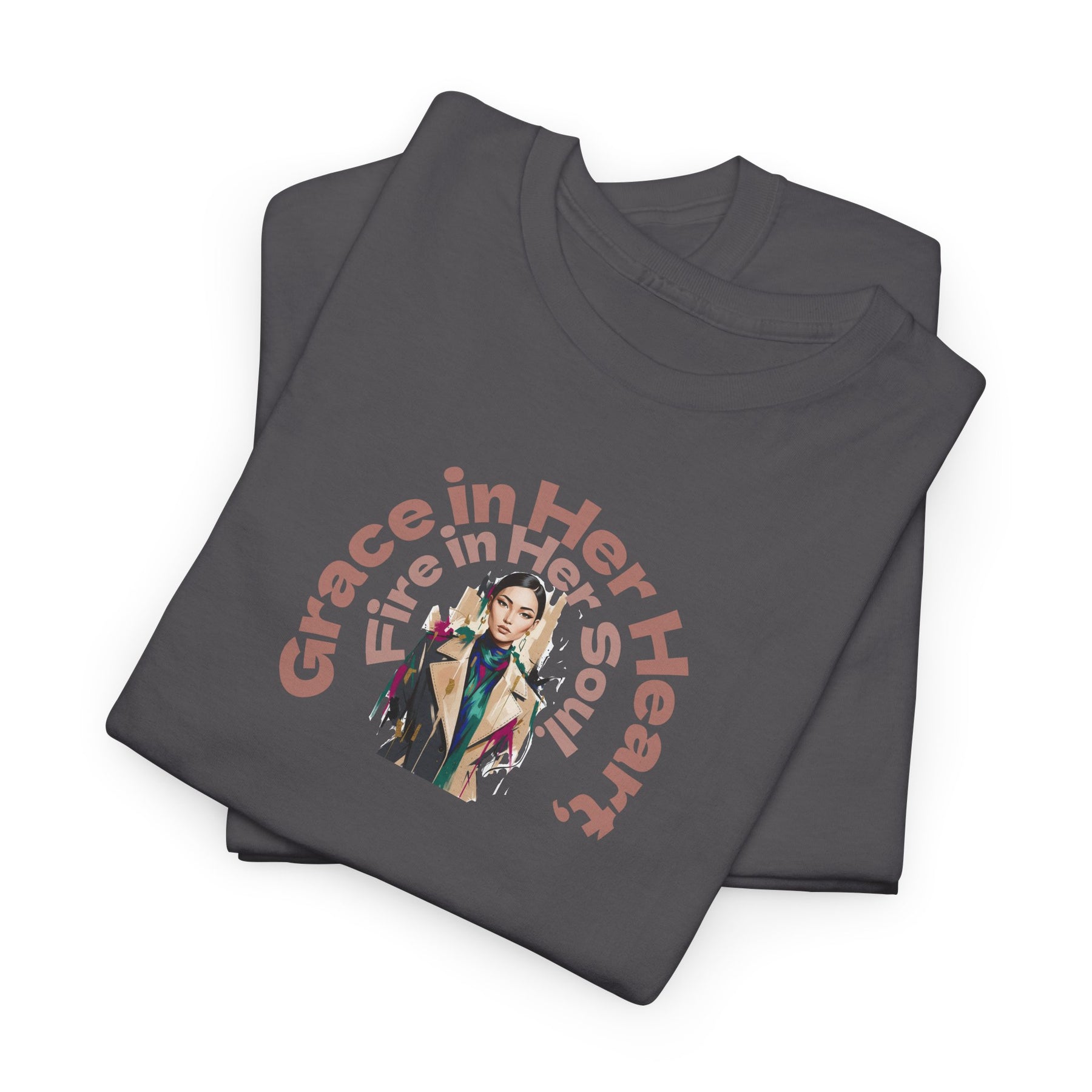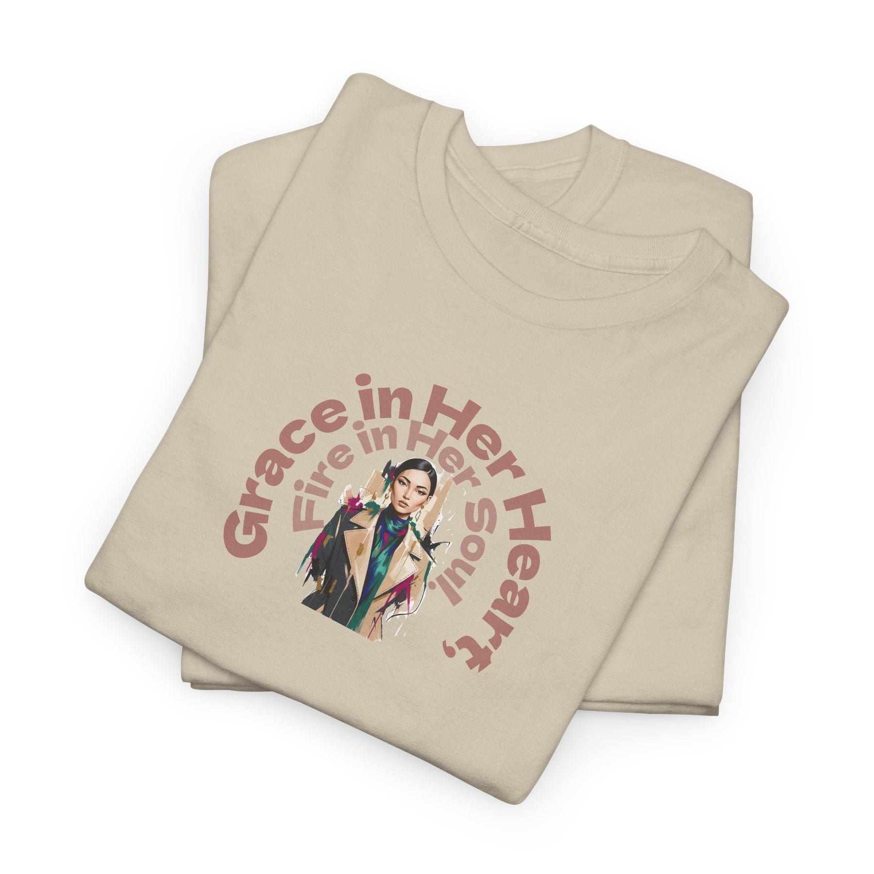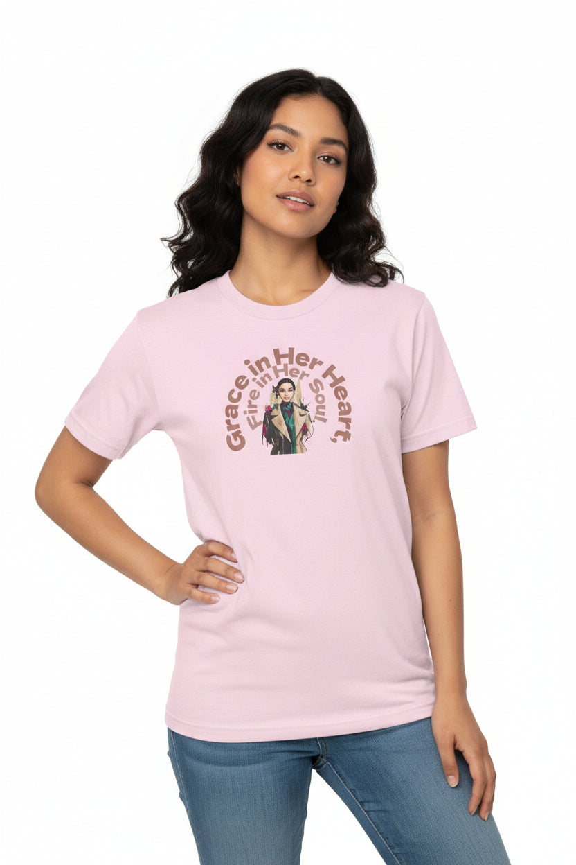 Soft, steady, and quietly fierce — this cotton tee carries the short poem “grace in her heart, fire in her soul” like a personal mantra. The line sits low-key yet confident on the chest, a reminder to breathe deep and move through the day with calm strength. Lightweight but sturdy, the shirt drapes in a relaxed, classic fit that works whether you’re layering under a jacket for an evening walk or wearing it solo with worn-in jeans on busy weekdays. It feels lived-in from the first wear: the ribbed collar holds its shape, the tubular knit gives a clean silhouette, and the tear-away label keeps things comfortable against your skin. Wear it to quiet mornings of journaling, to rallies where your voice matters, or to slow coffee dates — it’s for the person who wants their clothing to speak with gentle conviction rather than loud slogans.
