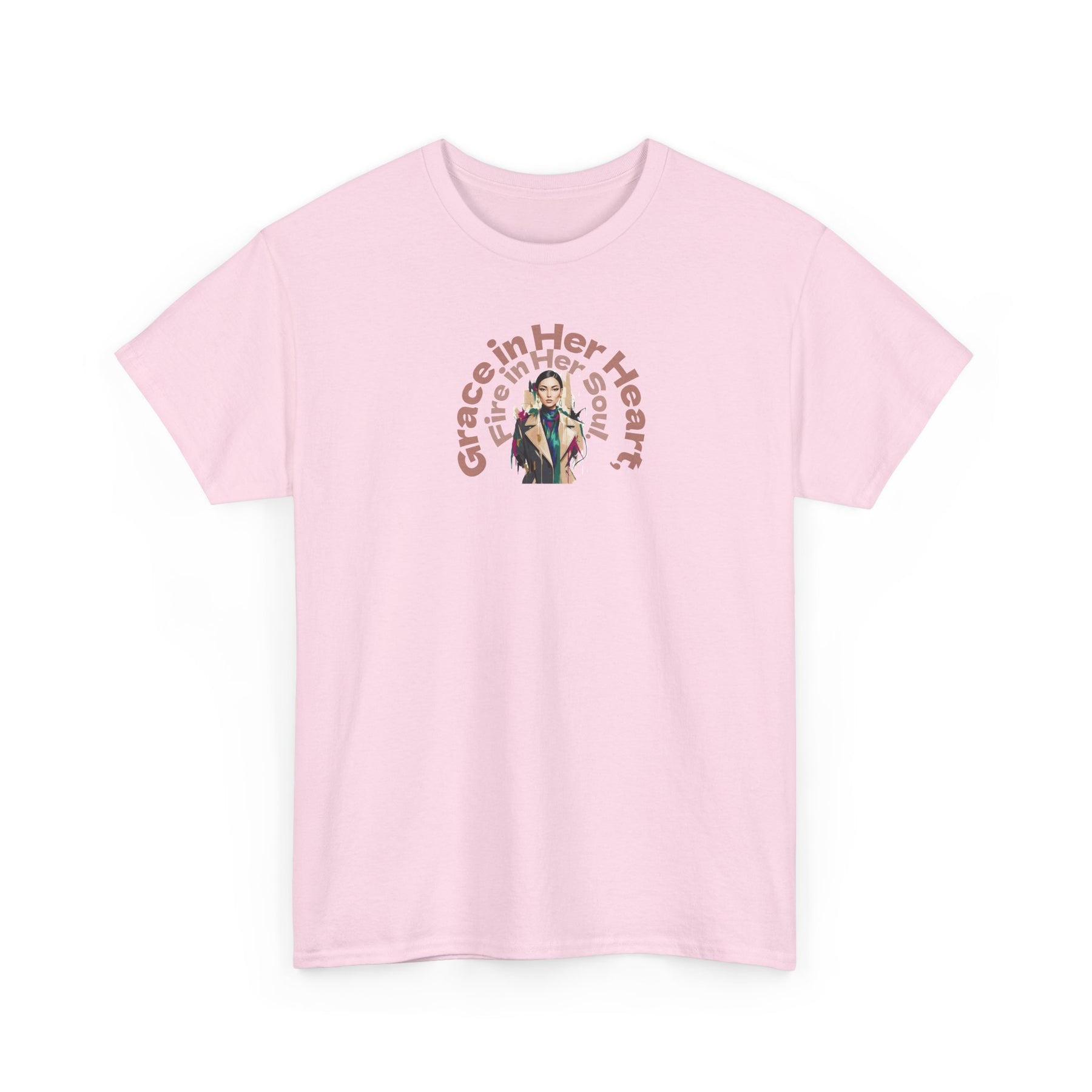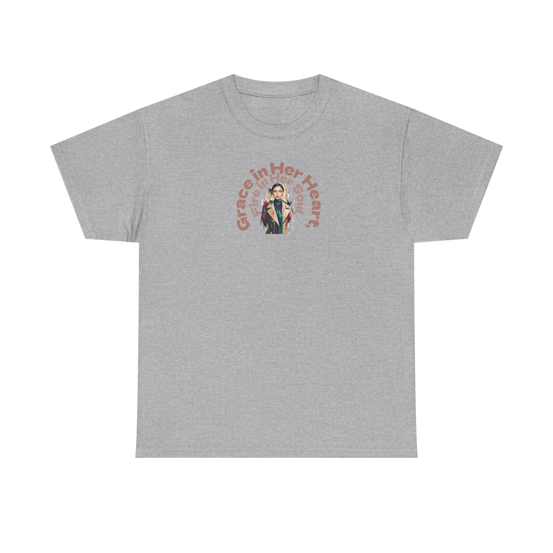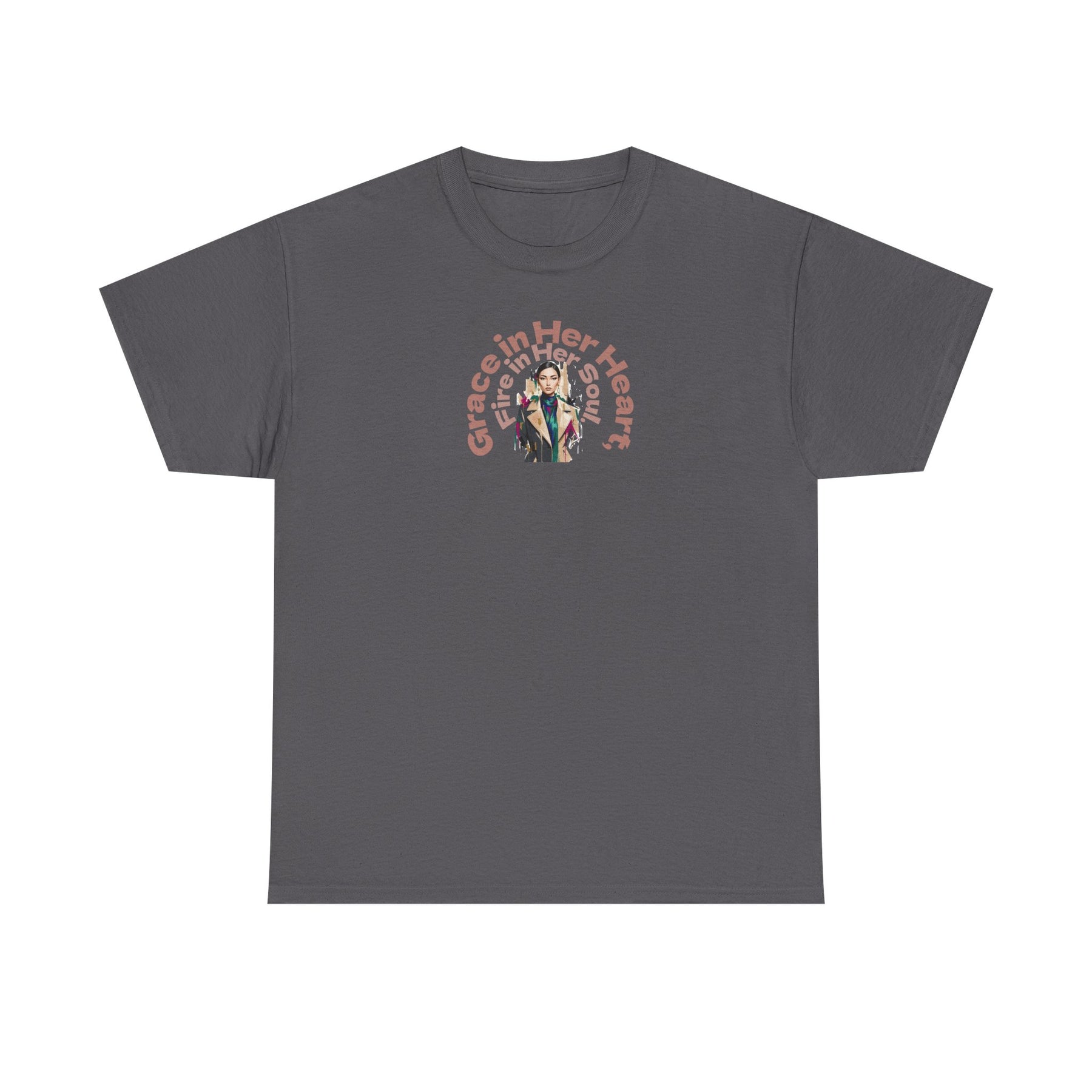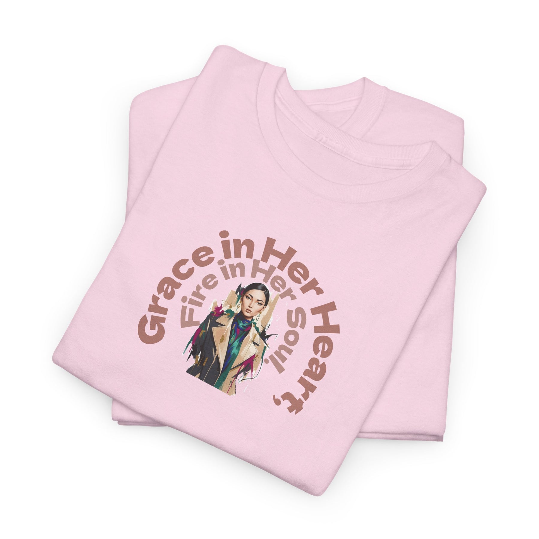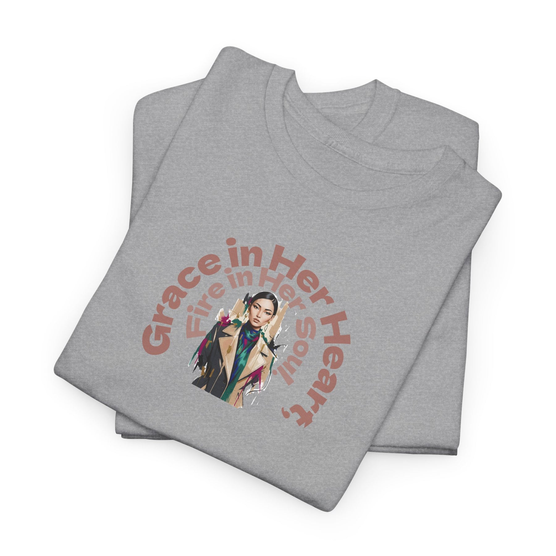 Soft, steady, and quietly fierce — this cotton tee carries the short poem “grace in her heart, fire in her soul” like a personal mantra. The line sits low-key yet confident on the chest, a reminder to breathe deep and move through the day with calm strength. Lightweight but sturdy, the shirt drapes in a relaxed, classic fit that works whether you’re layering under a jacket for an evening walk or wearing it solo with worn-in jeans on busy weekdays. It feels lived-in from the first wear: the ribbed collar holds its shape, the tubular knit gives a clean silhouette, and the tear-away label keeps things comfortable against your skin. Wear it to quiet mornings of journaling, to rallies where your voice matters, or to slow coffee dates — it’s for the person who wants their clothing to speak with gentle conviction rather than loud slogans.