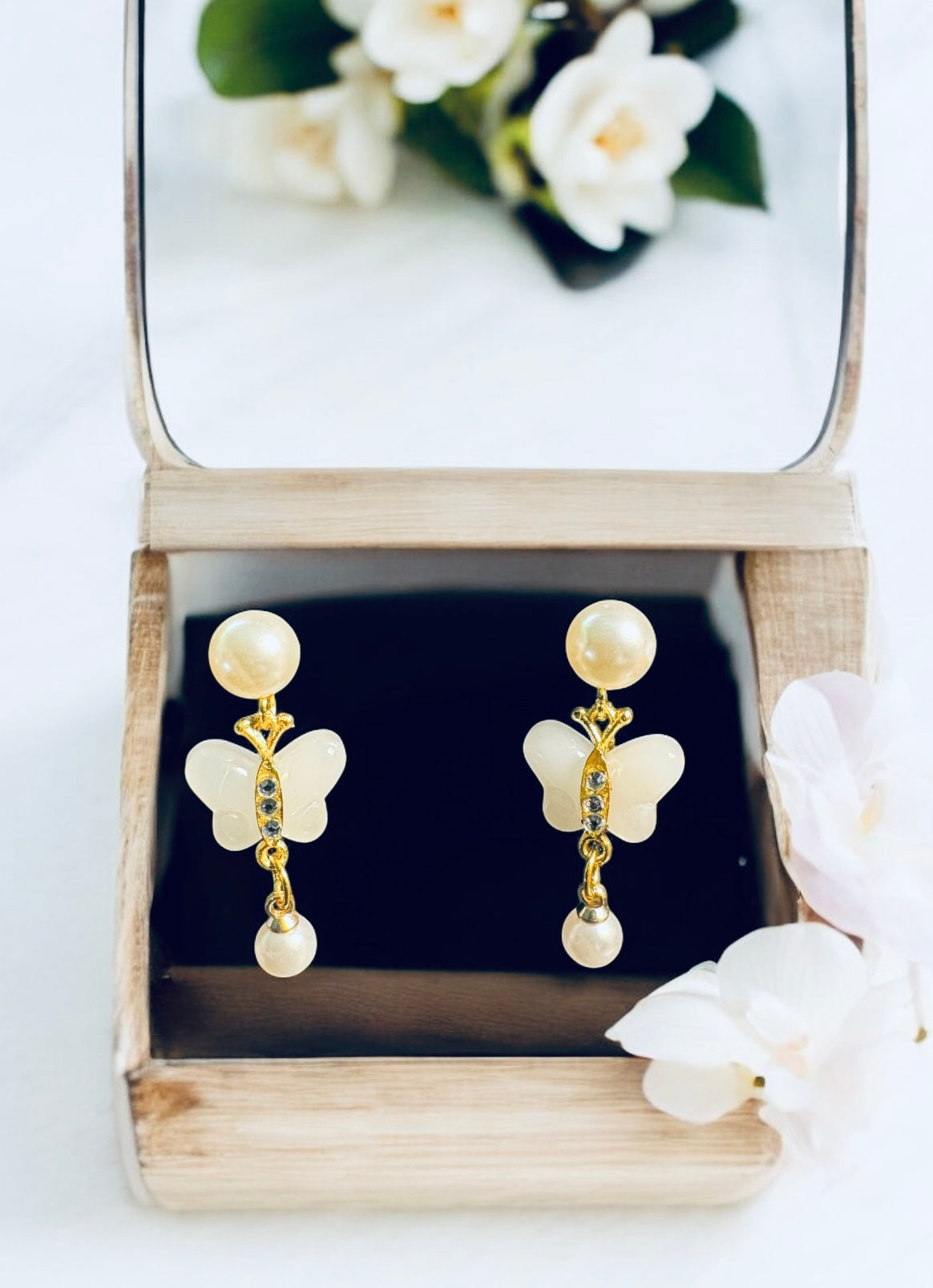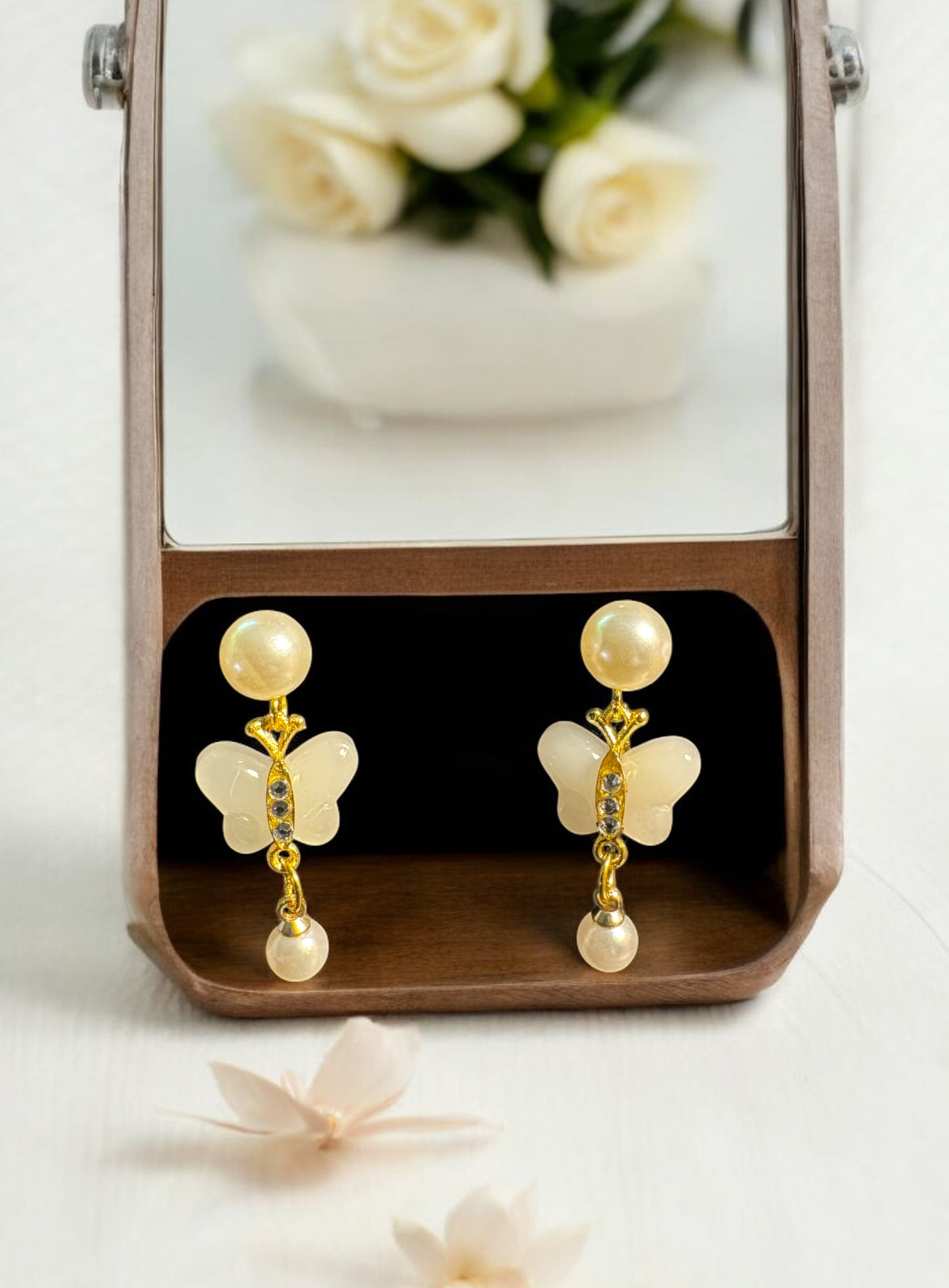 Delicate and feminine, these butterfly-shaped white jade earrings with artificial pearl dangles bring a graceful charm to any look. The smooth white jade adds a touch of elegance, while the pearl drop creates subtle movement and shine. Perfect for those who love jewelry with a soft, romantic feel, these earrings balance timeless beauty with modern style.