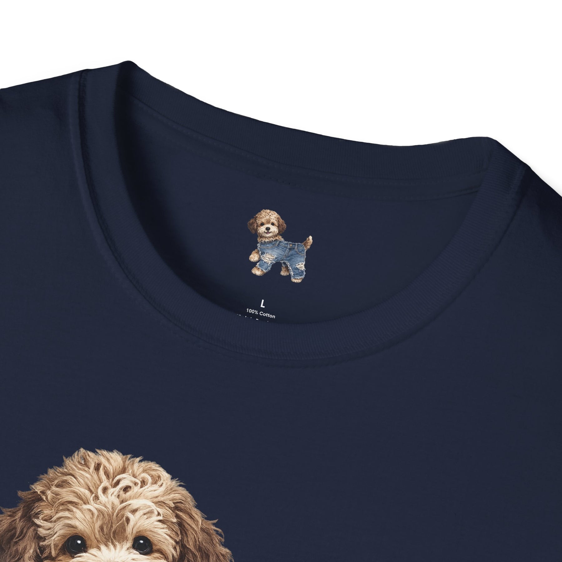 Navy blue t-shirt with a dog graphic on a white background