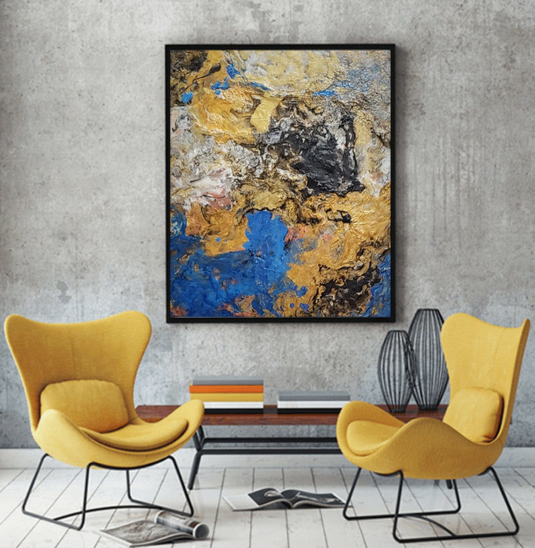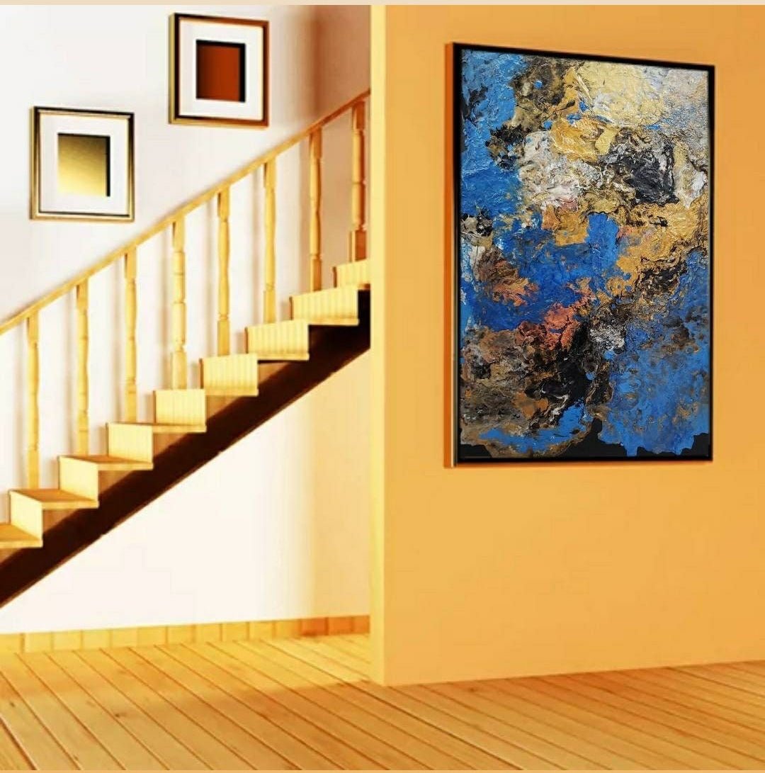 Immerse yourself in the captivating depth of this original abstract texture painting, where movement, light, and emotion intertwine. Hand-painted on a 16x20 inch stretched canvas, this piece features a striking blend of black, gold, and royal blue, creating a powerful contrast that evokes both mystery and elegance. Rich textured layers catch the light beautifully, giving the artwork dimension and sophistication from every angle.