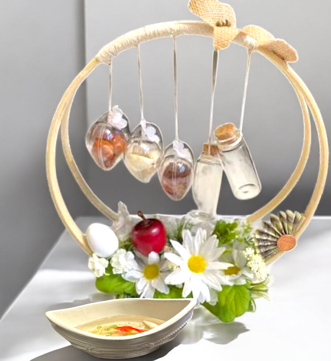 Handcrafted decorative hanging display with glass orbs and flowers, featuring a stylish epoxy resin serving tray.