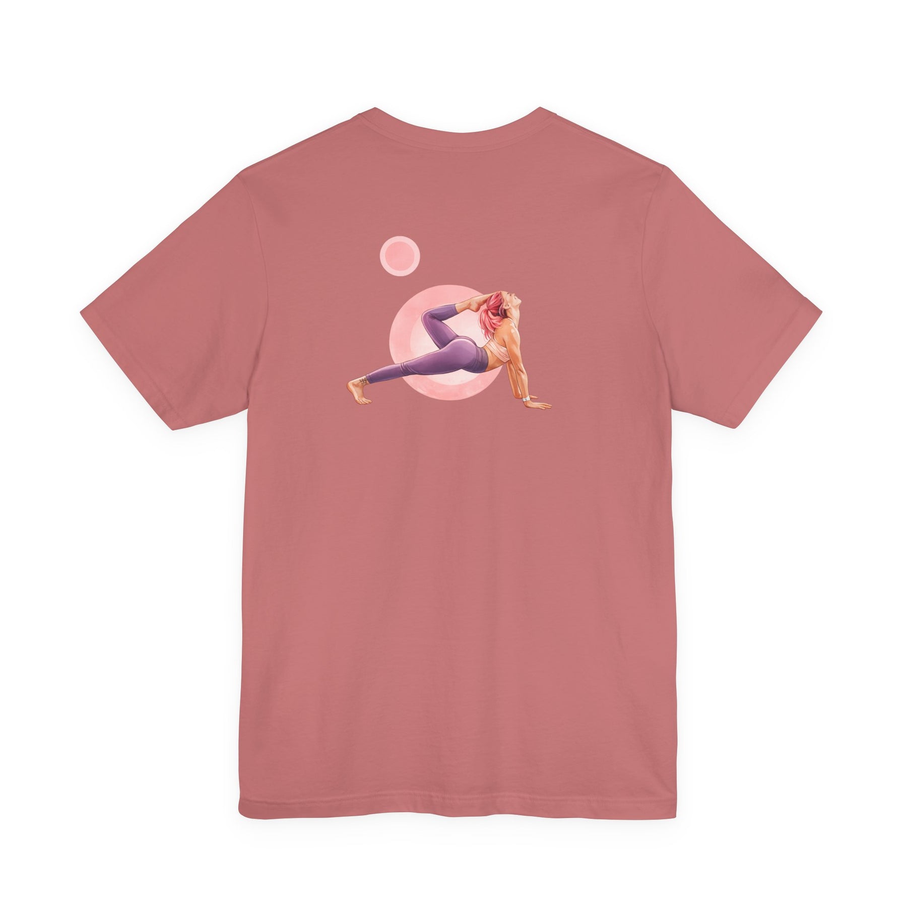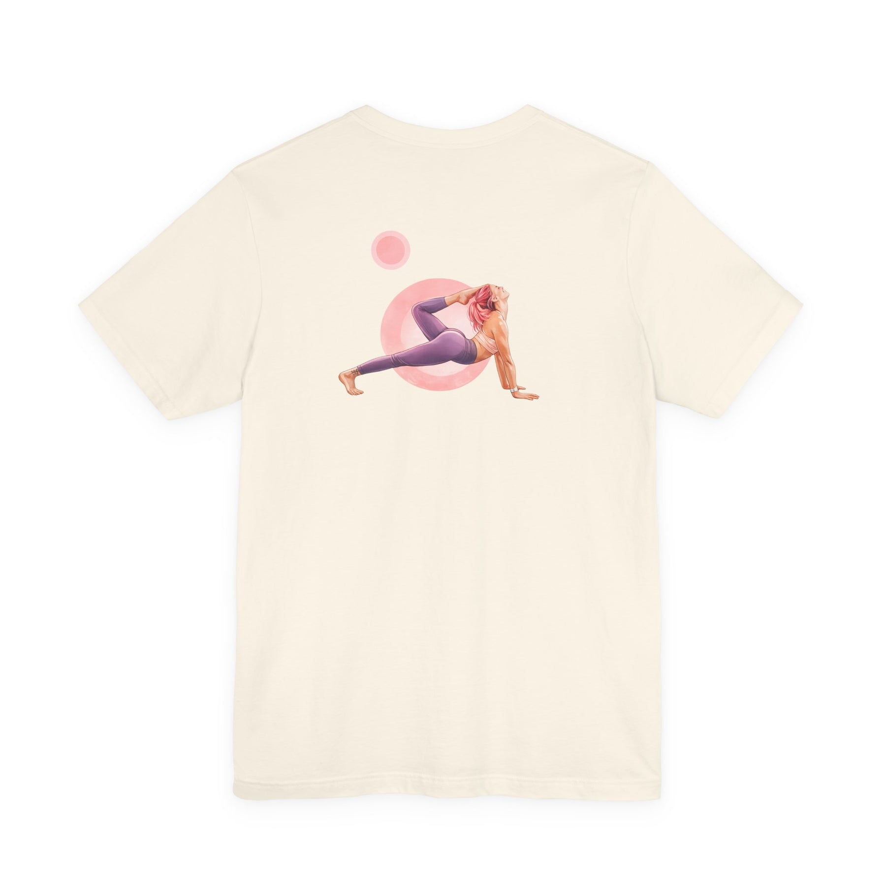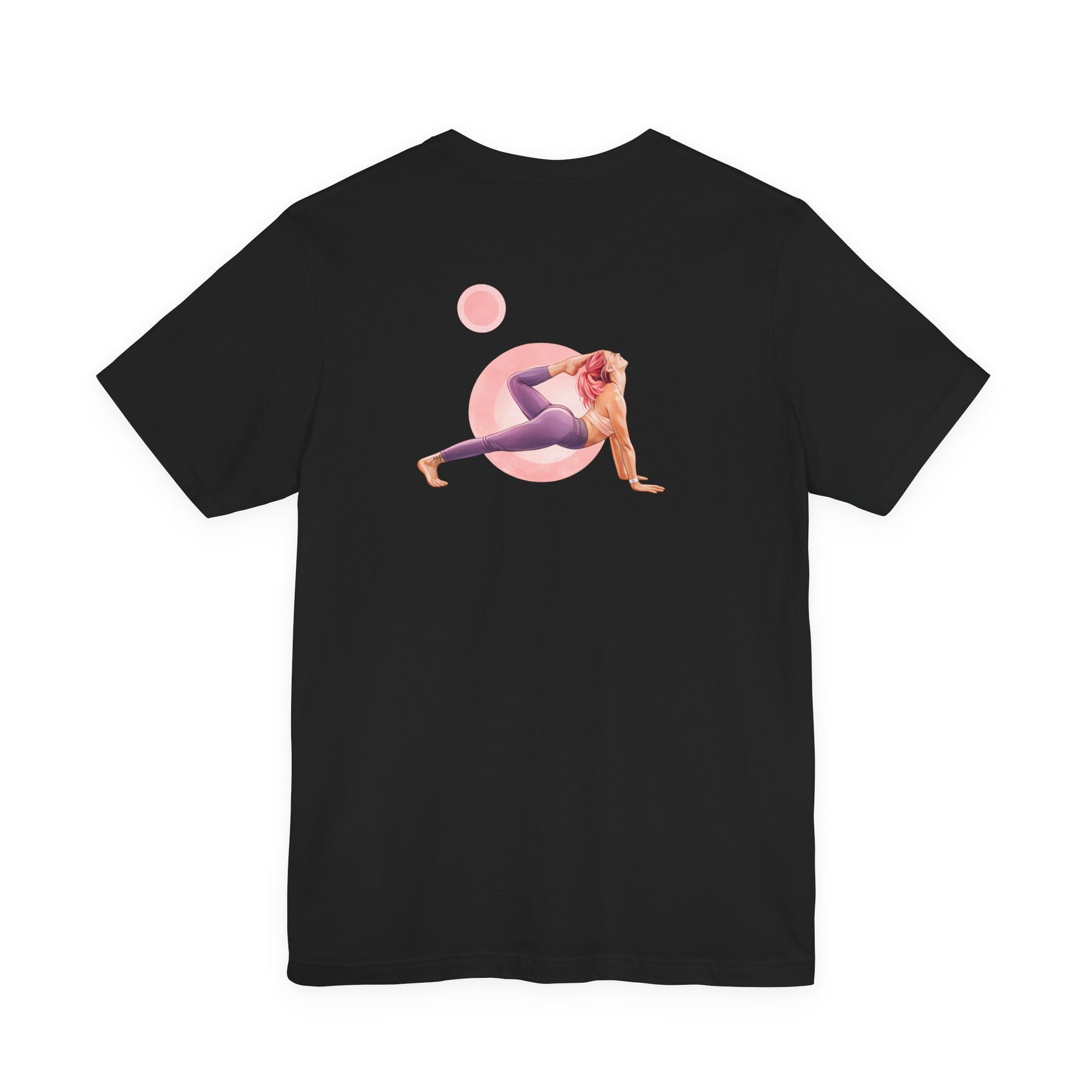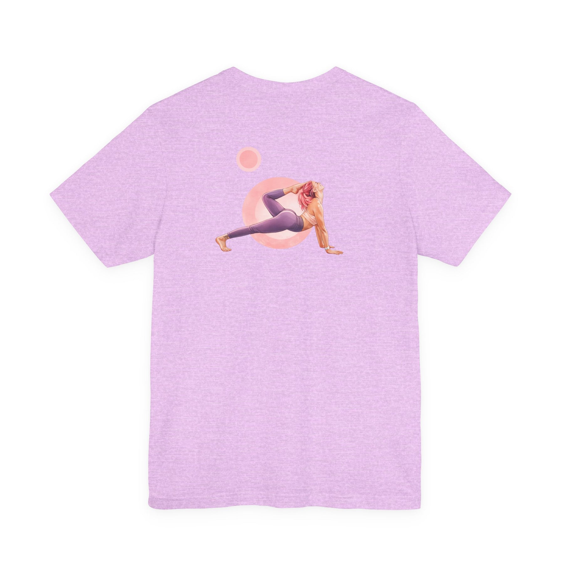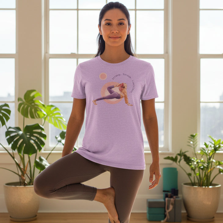 Purple t-shirt with a graphic of a person in a yoga pose and text on a white background