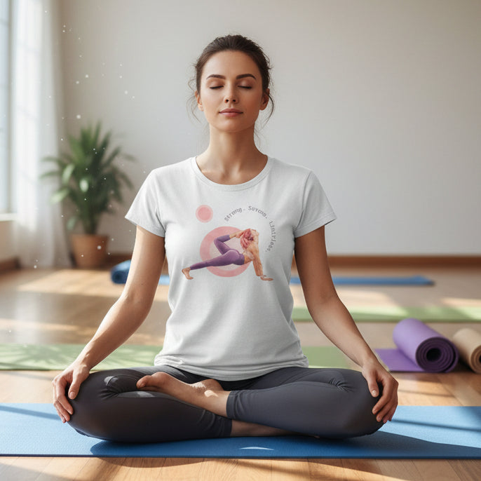 White t-shirt with a graphic of a person in a yoga pose and text on a white background