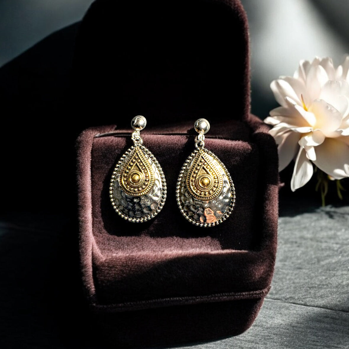handmade vintage teardrop earrings Embrace timeless elegance with these handcrafted teardrop dangle earrings in silver and antique gold tones. The delicate teardrop shape adds a touch of sophistication, while the soft metallic contrast gives them a vintage charm that never fades.